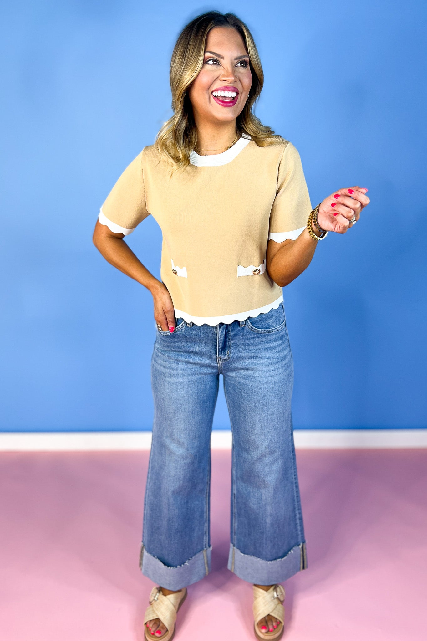Beige Contrast Band Front Button Detail Scallop Trim Top *FINAL SALE*