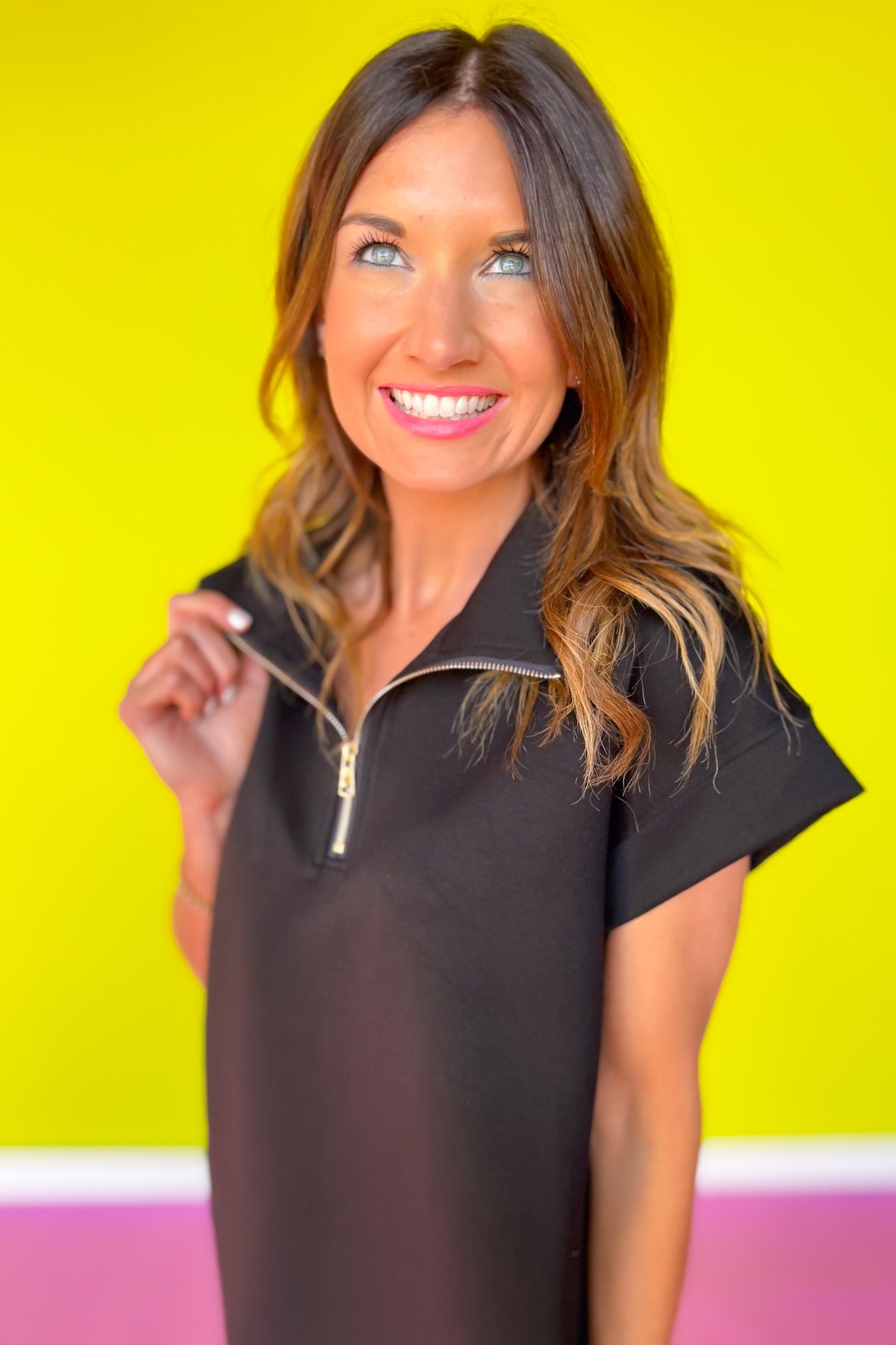Introducing the SSYS Pleated Hem Taylor Air 3/4 Zip Dress in Black. She is so versatile and will be a year round piece that you will gravitate to time and time again. She is made from the air fabric that we are all obsessed with, has a cap sleeve, functional and signature gold zipper that can be zipped up for a funnel neckline or open collar look and we added a pleated hem for a feminine touch. Your new best friend is tailored, chic, comfortable and elevated! Don't miss out on her! Shop our collection of SHOES and ACCESSORIES to complete your ensemble!