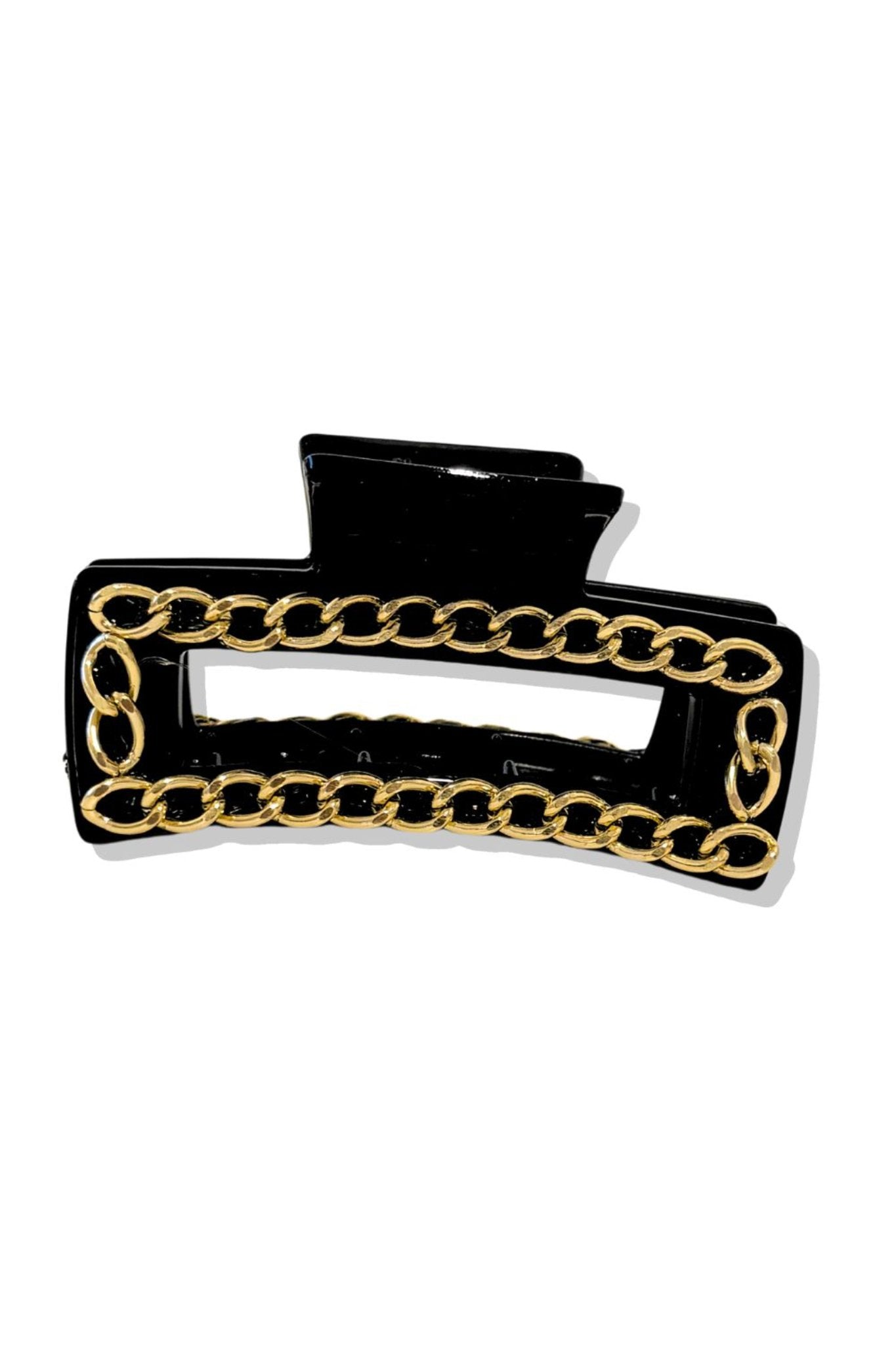 Bring a bit of chicness to your everyday style with this cool rectangular claw clip! It features a black chain detail and a secure grip, so your hair will stay just how you placed it throughout the day. Get ready to be a trendsetter!