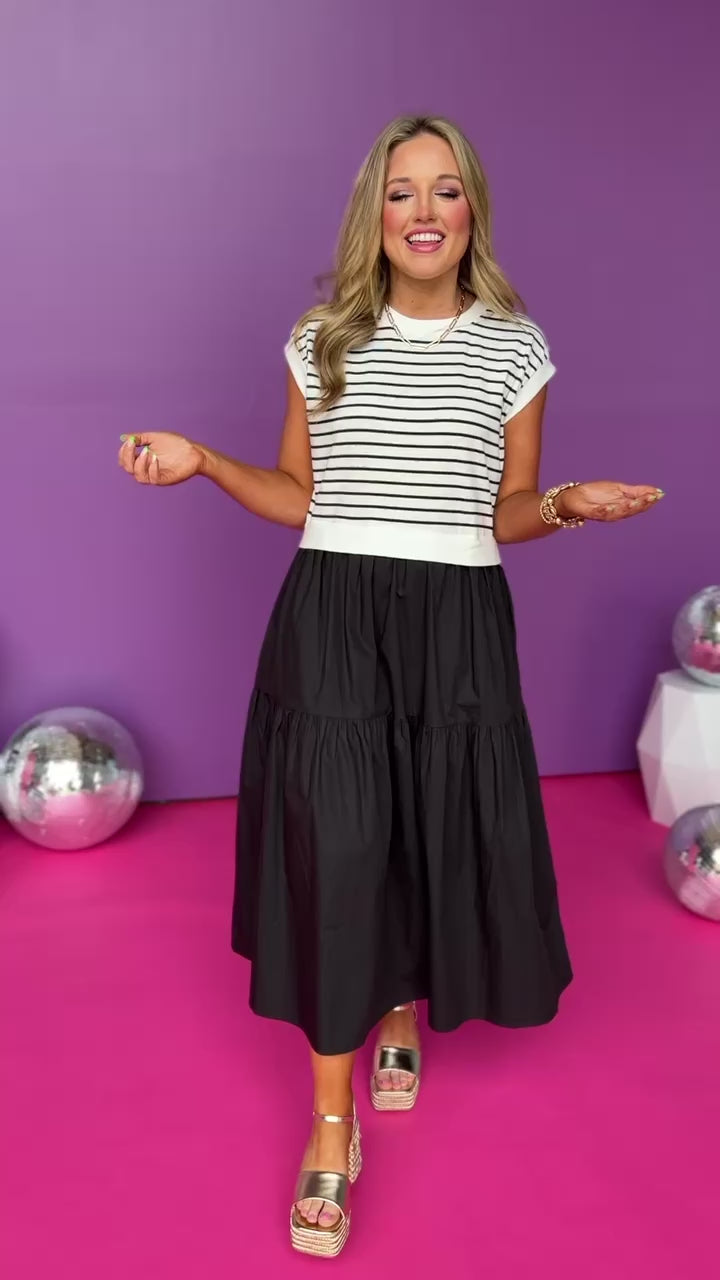 Introducing our Black Crew Neck Half Striped A Line Flare Midi Dress, guaranteed to be effortlessly chic and comfortable. This dress features a classic crew neckline and trendy half striped top, with a flattering A-line flare skirt and midi length. This piece would be so good for all our teacher gals and it has side pockets! Style with sandals or elevate with platform wedges, this one is an easy YES!