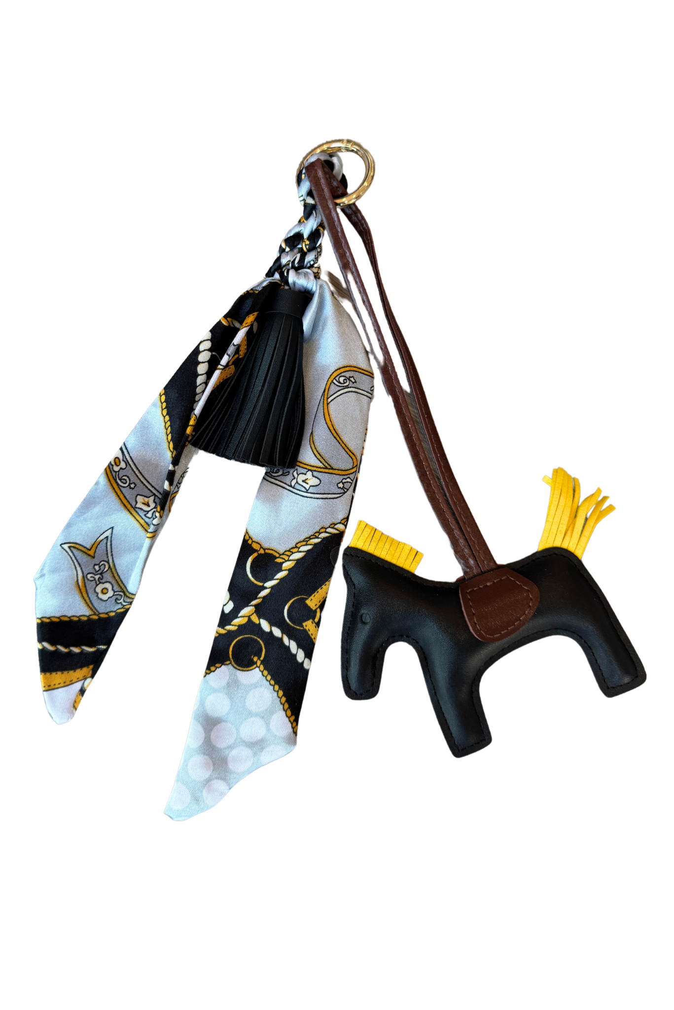 Add some playful charm to your bag with the Black Faux Leather Horse Tassel Scarf Keychain Bag Charm. Make a stylish statement with the black faux leather horse and tassel scarf bag charm, who says you can't accessory your bag. Perfect for any fashion lover!