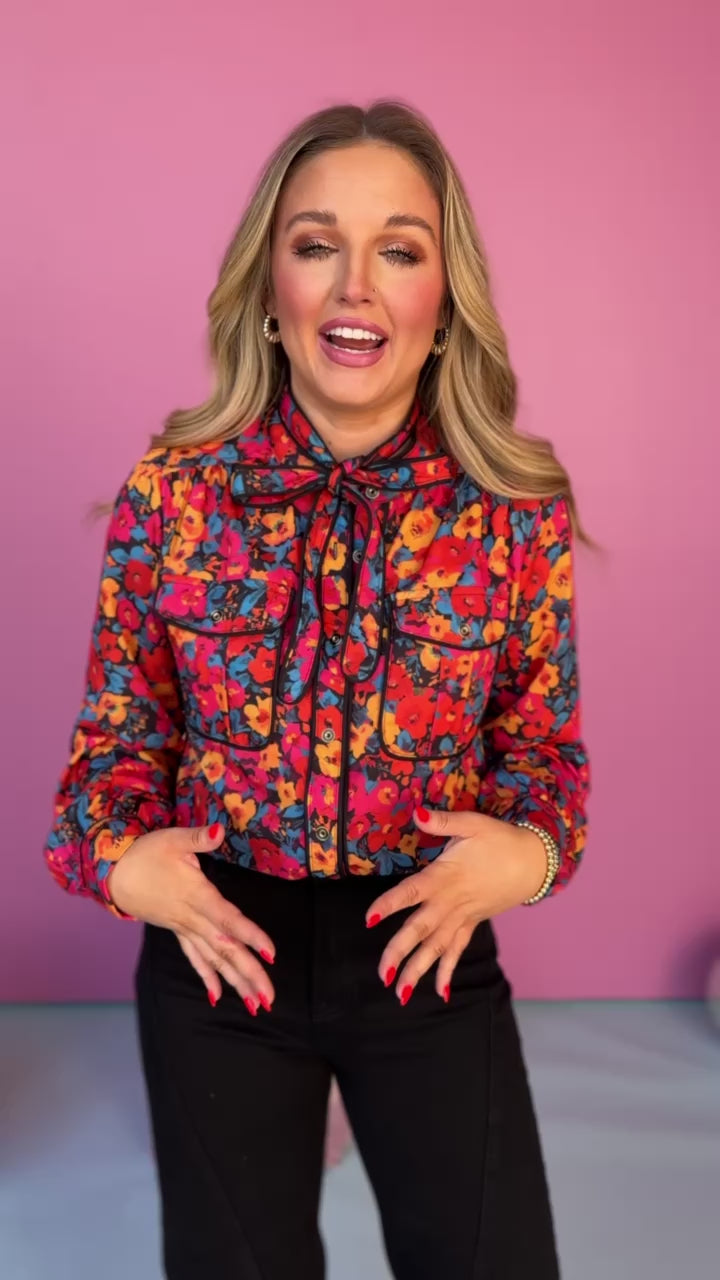 This Black Floral Printed Tie Neck Contrast Piping Top is the perfect blend of stylish and classic! Crafted from a soft and lightweight material, this top feature a black floral print, tie-neck, and contrast piping details. It will level up any look paired with your favorite bottoms this season!