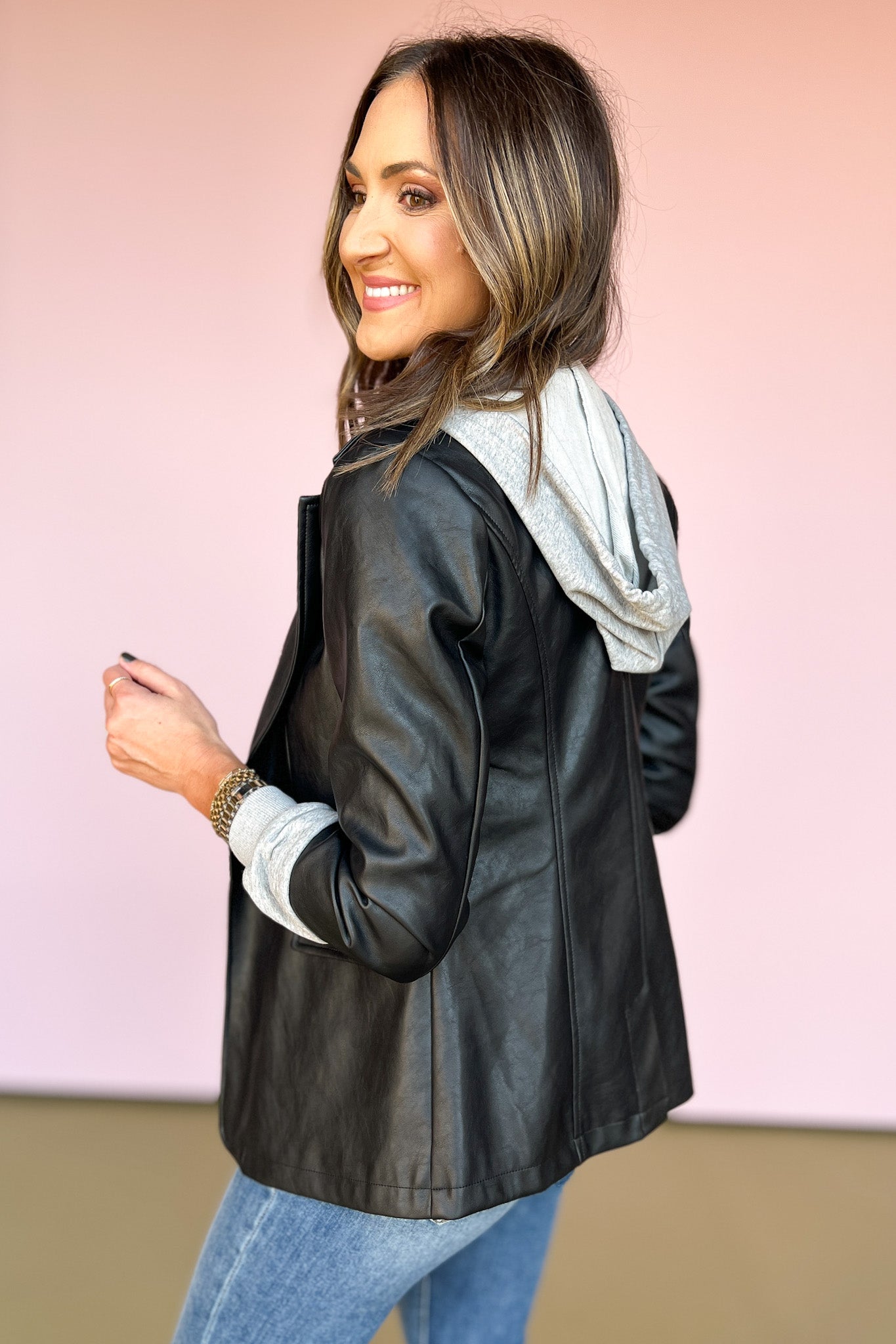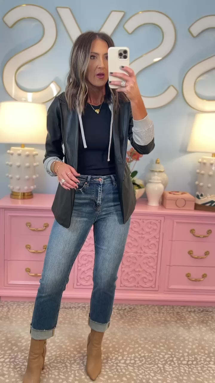 Look sharp and sleek with our Black Mixed Media Faux Leather Hooded Blazer! The perfect fusion of style and comfort, this blazer will keep you looking chic while keeping you cozy. With a faux leather finish and a hood for added style points, this blazer is a must-have for trendsetters looking to make a statement. Shop our TOPS and BOTTOMS to style out your look. Work it ladies!