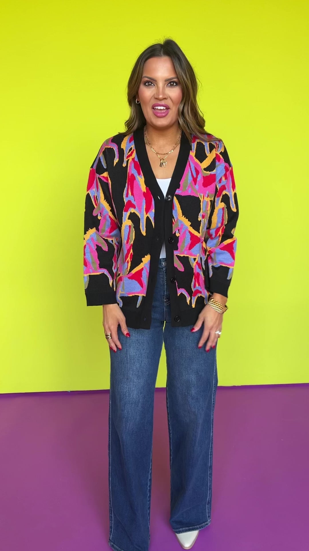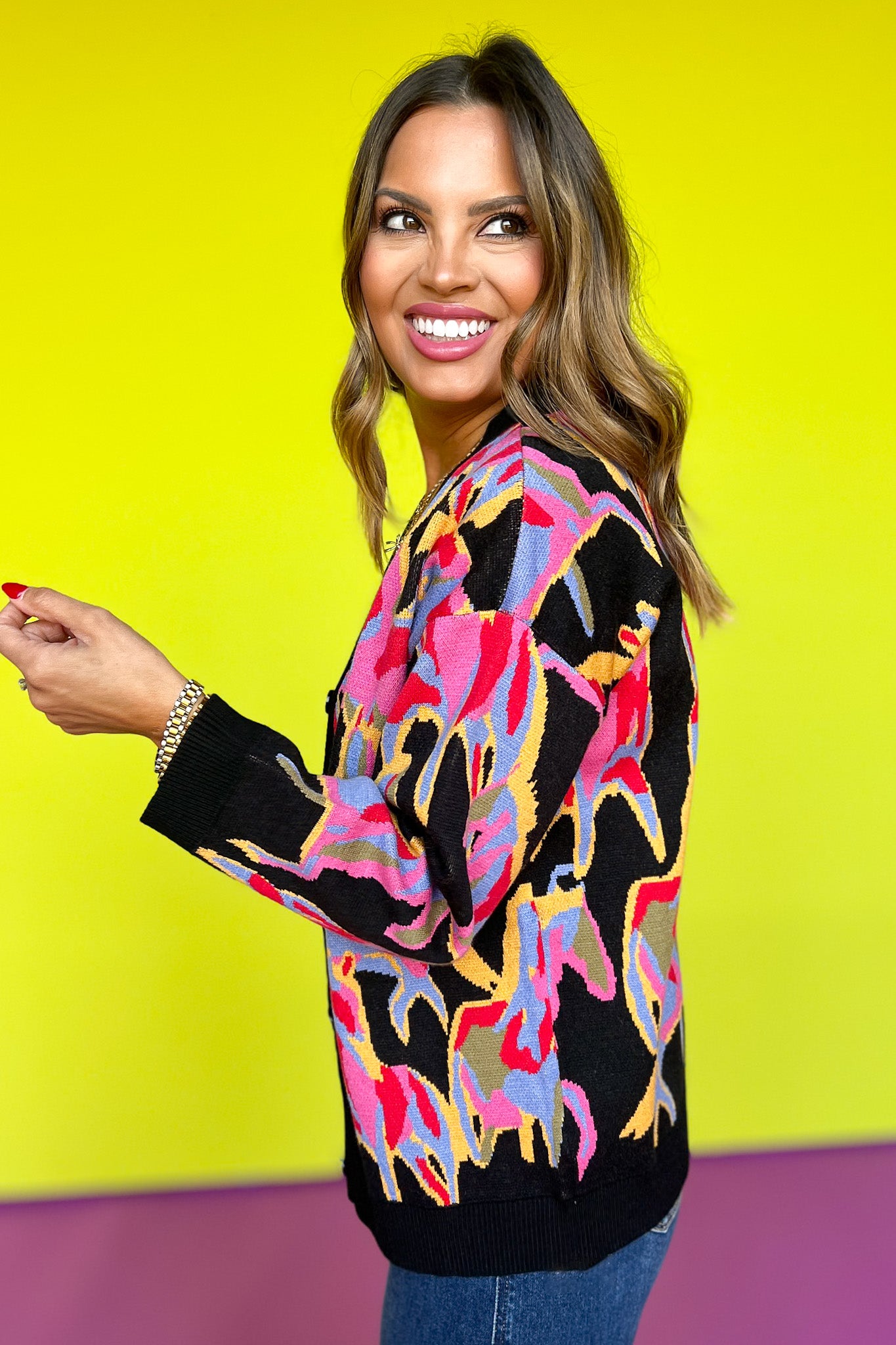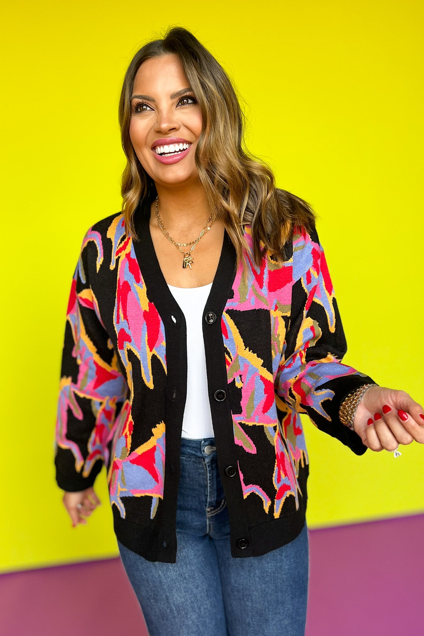 Introducing our Black Multi Abstract Print Knit Button Up Cardigan! This unique piece features an eye-catching abstract print that will make a statement wherever you go. The button-up design allows for versatile styling options, while the soft knit material will keep you warm and comfortable. Perfect for adding a touch of whimsy chic to any outfit. Shop our DENIM and SHOES to build your look and own the day in style gals!