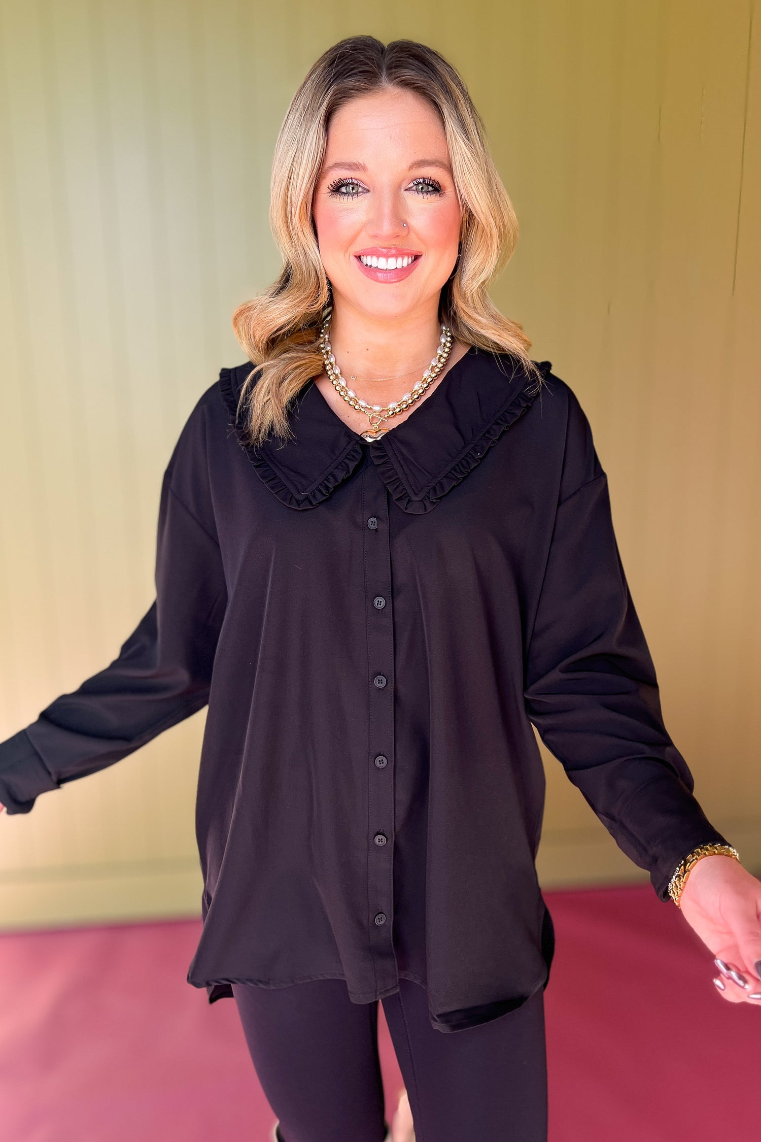 Add a touch of sophisticated chic to your wardrobe with our Black Peter Pan Collar Button Up High Low Hem Top. This unique top features a charming Peter Pan collar and a flattering hi-low hemline. Perfect for adding a charming spin to any outfit, it's a must-have for any fashion-forward individual! Style with denim or leggings and booties and you rock the day in style! Shop our BOTTOMS and SHOES to elevate your look!
