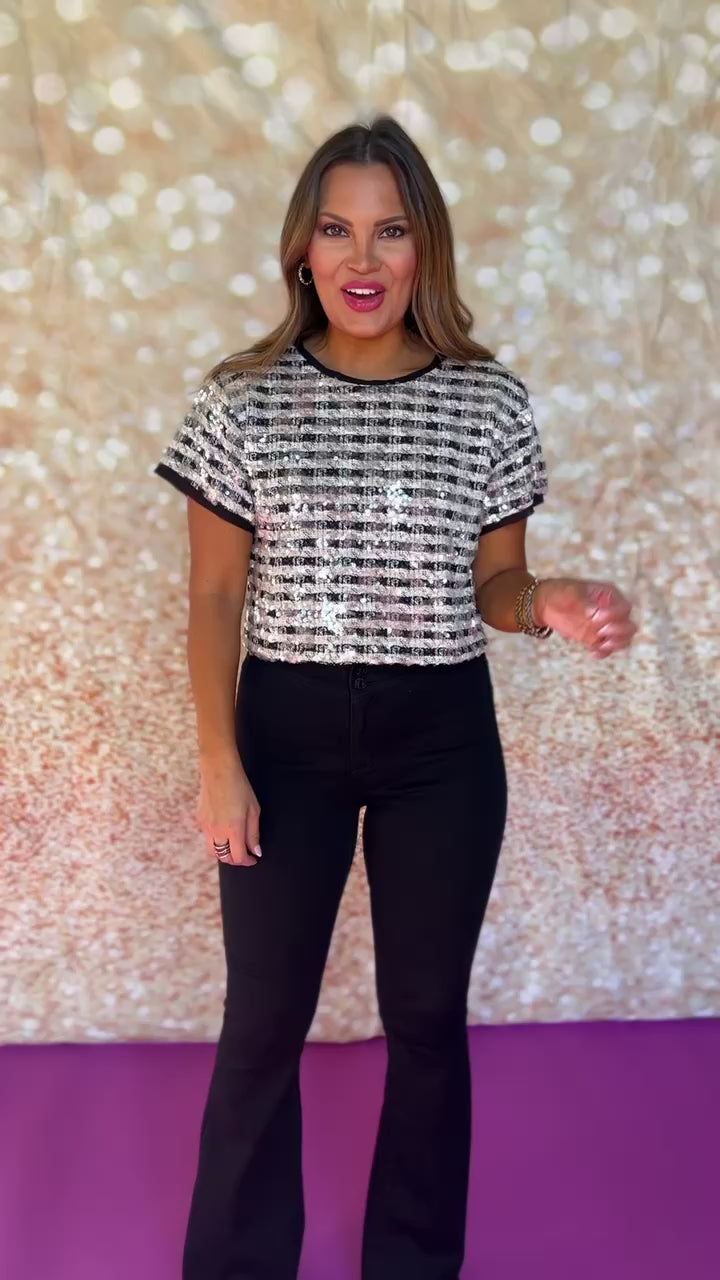 Introducing our Black Plaid Shimmer Overlay Crew Neck Top! With its shimmering overlay, this top adds a touch of glam to any outfit. Perfect for a whimsy, fun-loving fashionista who isn't afraid to stand out. Perfect for date night or a girl's night out! Shop our BOTTOMS and SHOES to create your chic look!