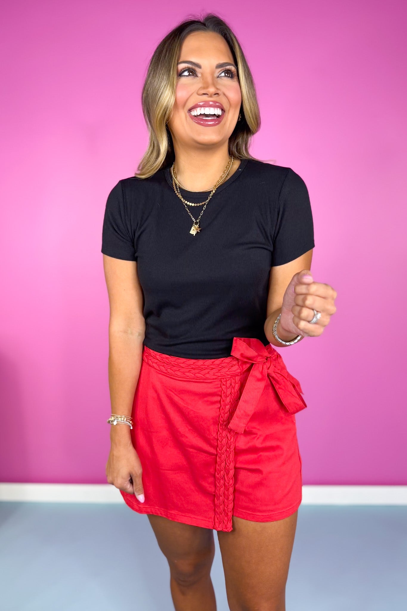 Elevate your basic wardrobe effortlessly with this Black Ribbed Round Neck Short Sleeve Top. This versatile ribbed top features a classic round neck design and short sleeves for ultimate comfort and style. Perfect for any occasion, this versatile top will become a staple in your wardrobe. Pair with denim shorts and sneakers for an effortless out the door look! Shop our BOTTOMS and SHOES for your perfect ensemble!