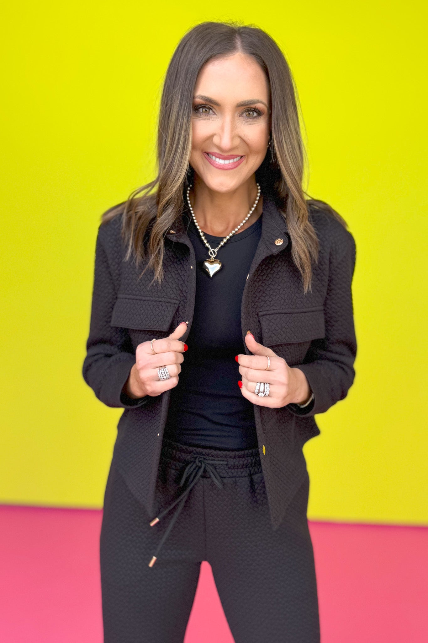DOESN'T GET BETTER THEN THIS! Introducing the SSYS Tyler Cropped Diamond Quilted Black Shacket!!! The response to the original SSYS Tyler Shacket was through the roof, so we had to bring it back in an updated form! The cropped length is perfect to wear as a set with the matching joggers HERE or as a stand alone piece with other athleisure BOTTOMS or DENIM - tons of flexibility and options! You know and love the SSYS Tyler, so add to the play and the possibilities are ENDLESS!