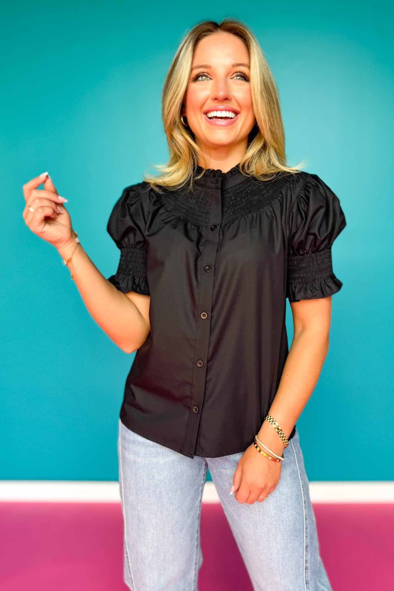 Romantic and refined, the Dahlia Smocked Top in Black by SSYS The Label is a timeless piece that blends elegance with everyday wearability. Featuring a beautifully smocked neckline and sleeves, this top adds texture and feminine charm to your wardrobe. The button-front design offers a polished finish, while the puff sleeves create a chic, statement silhouette.