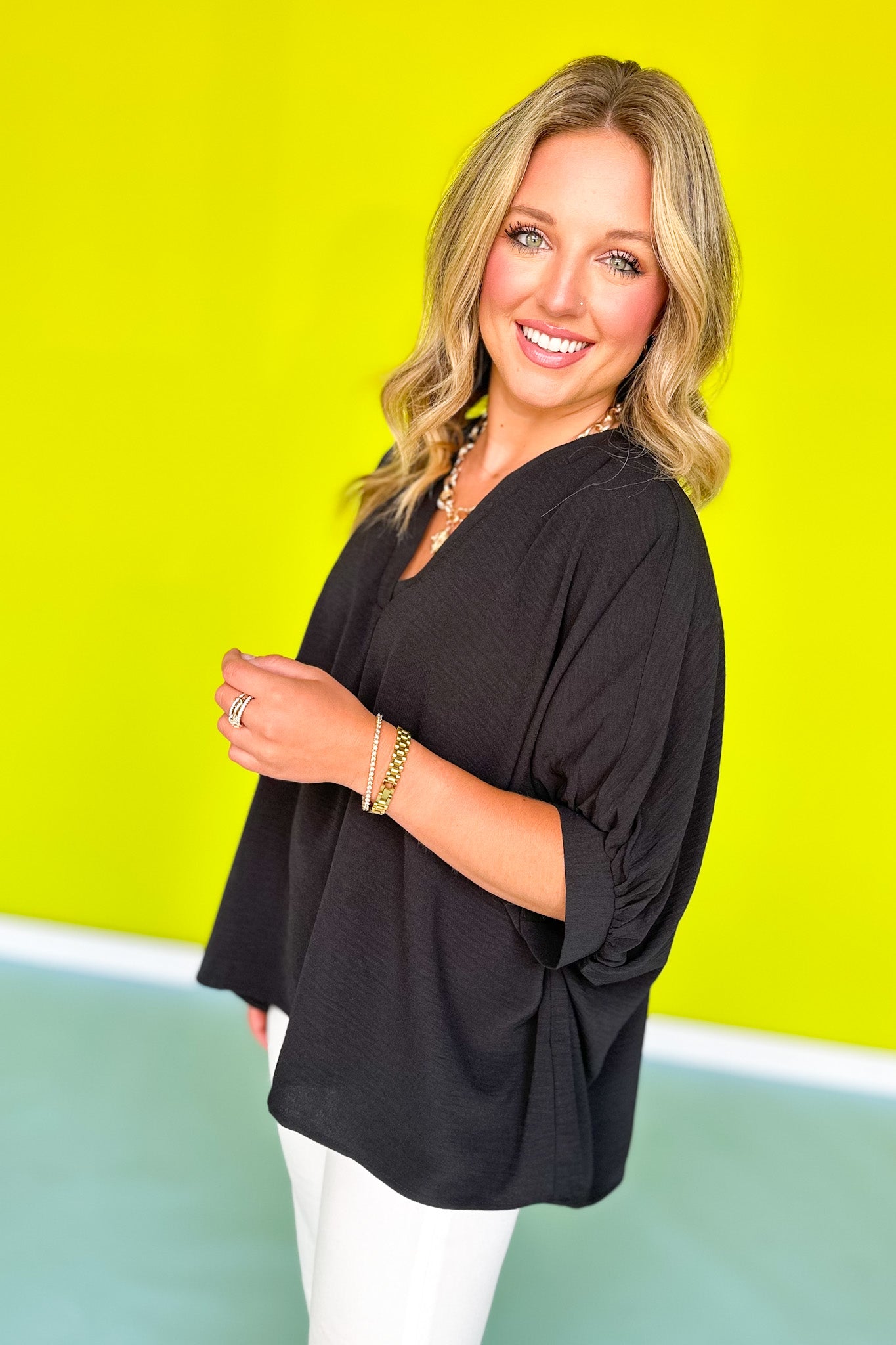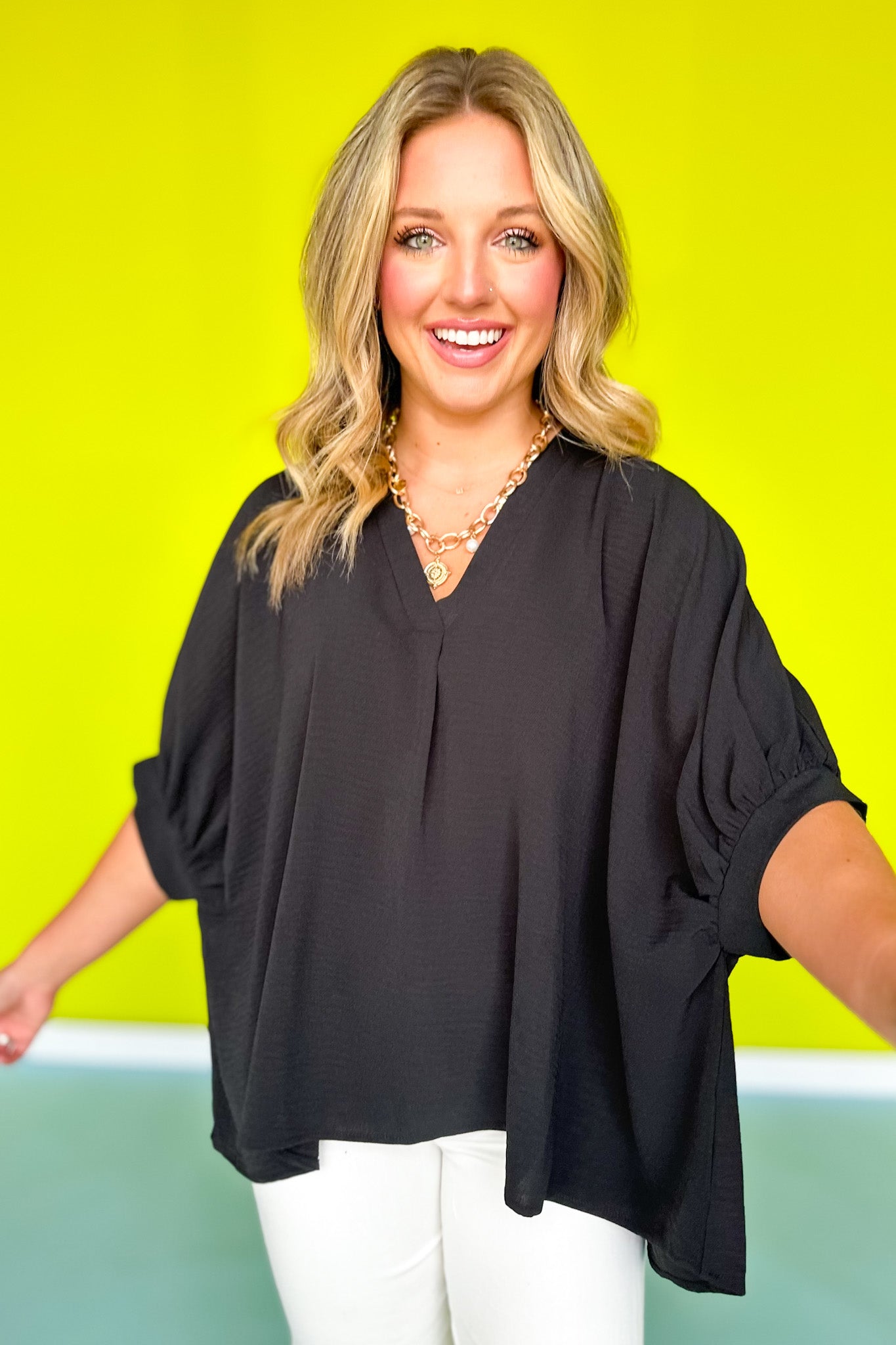 Meet your new wardrobe bestie – introducing our chic Black V Neck Half Puff Sleeve Top! The sleeves add a pinch of drama while the V-neck brings the classic and flirty vibes. Perfect for those "nothing to wear" moments, this top transforms your look and so versatile! Shop our BOTTOMS and SHOES to build your effortless OOTD!