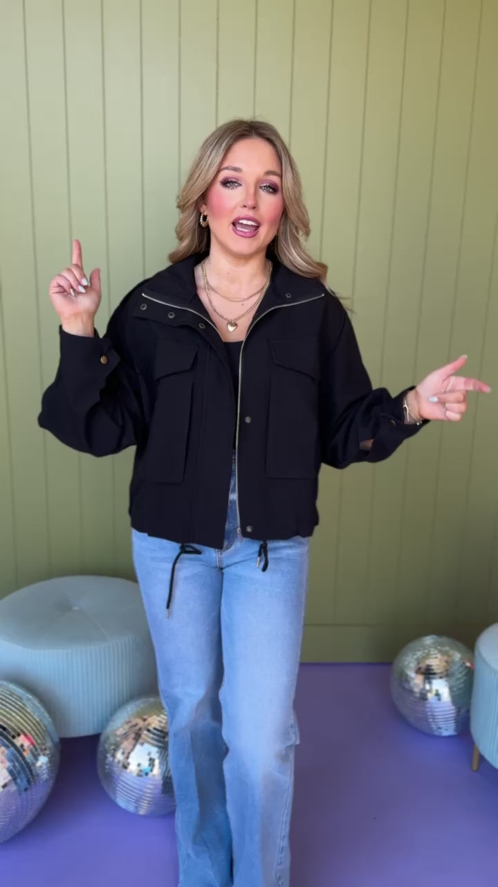 This Black Zip Front Pocket Detail Bomber Jacket features so many FUN details! You are going to love the high neck, big flap pockets, tab shoulder details, long peasant sleeves, buttoned cuffs, hidden zipper closure, and drawstring hemline. The added pocket details and zipper closure make it a stylish, yet practical for your cooler weather closet!