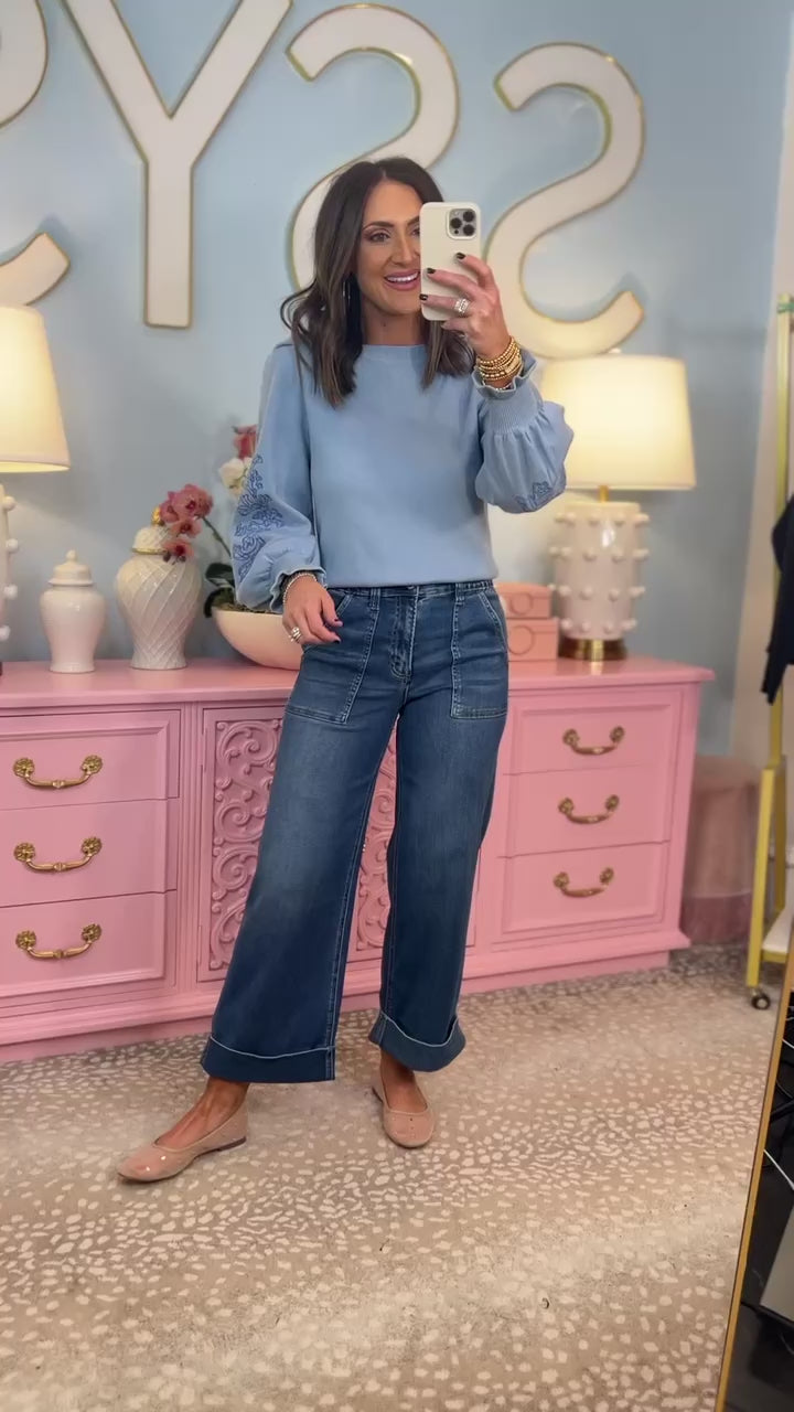Add a touch of cozy chic to your wardrobe with our Blue Embroidered Frill Cuff Sleeve Sweater. The embroidery detail adds a feminine touch, while the frill cuff sleeves make a charming statement. Perfect for layering or wearing on its own, this sweater will keep you cozy and stylish everywhere you go! Shop our DENIM and SHOES to build your look and get ready for compliments.
