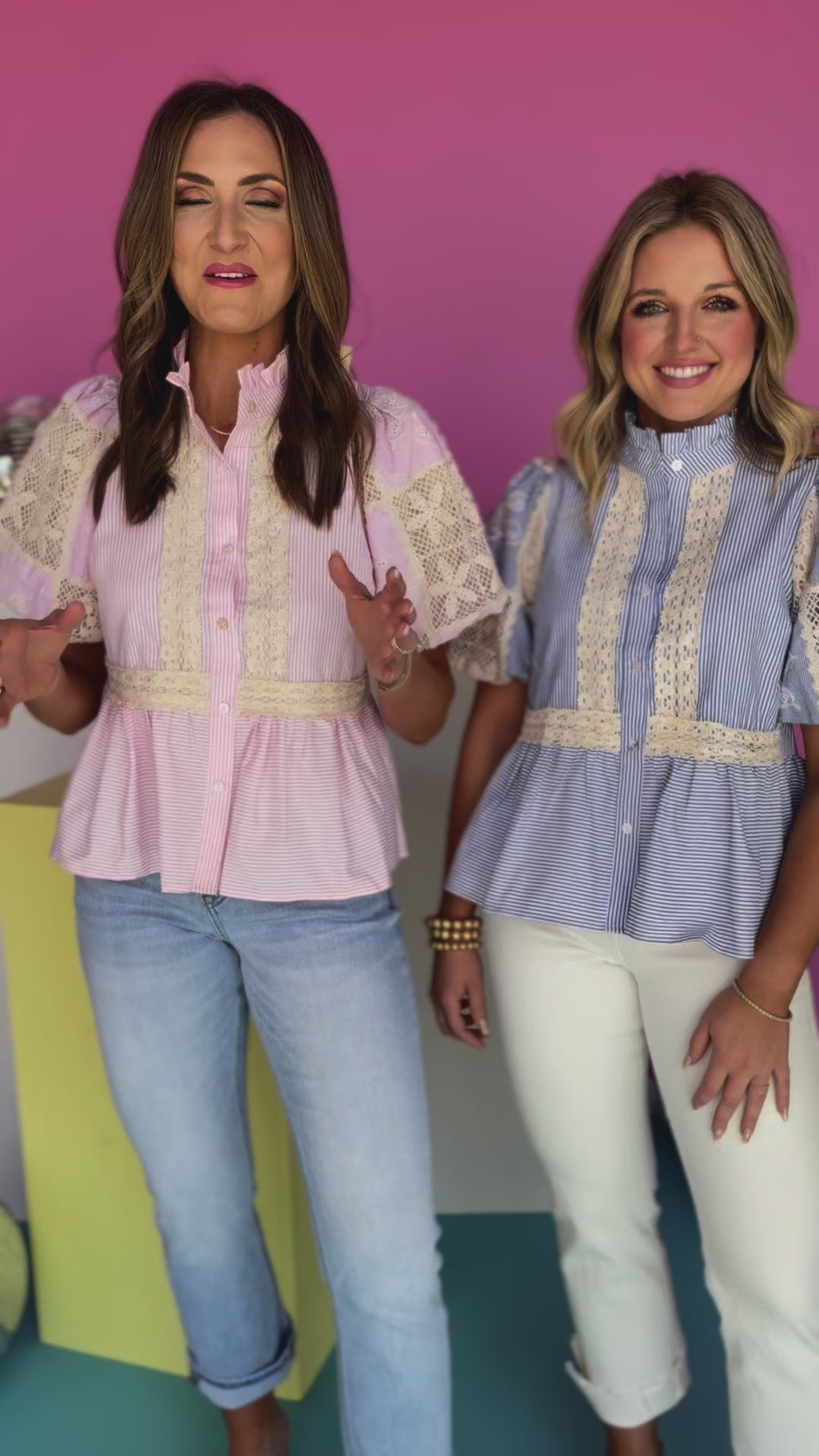 Unleash your unique style with this Blue Striped Crochet Detail Front Button Peplum Top. The eye-catching crochet detail adds a touch of playful texture to this stylish top, while the front buttons and peplum design create a flattering silhouette. Perfect throw on and go top that will have you feeling and looking elevated! Need styling inspiration? Shop our BOTTOMS and SHOES to build your precious OOTD!