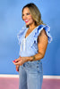 Add a touch of whimsy chic to your wardrobe with our Blue V Neck Bow Detail Multi Ruffle Shoulder Top. The playful ruffle shoulder detailing and cute bow accent will set this top above the others. Perfect for a casual elevated OOTD! How darling would this top be paired with white denim? SO CHIC! Shop our DENIM and SHOES to build your look!