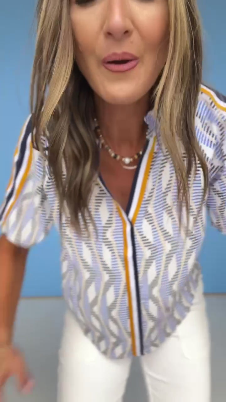 Blue Zig Zag Stripe Contrast V Neck Collared Top *FINAL SALE*