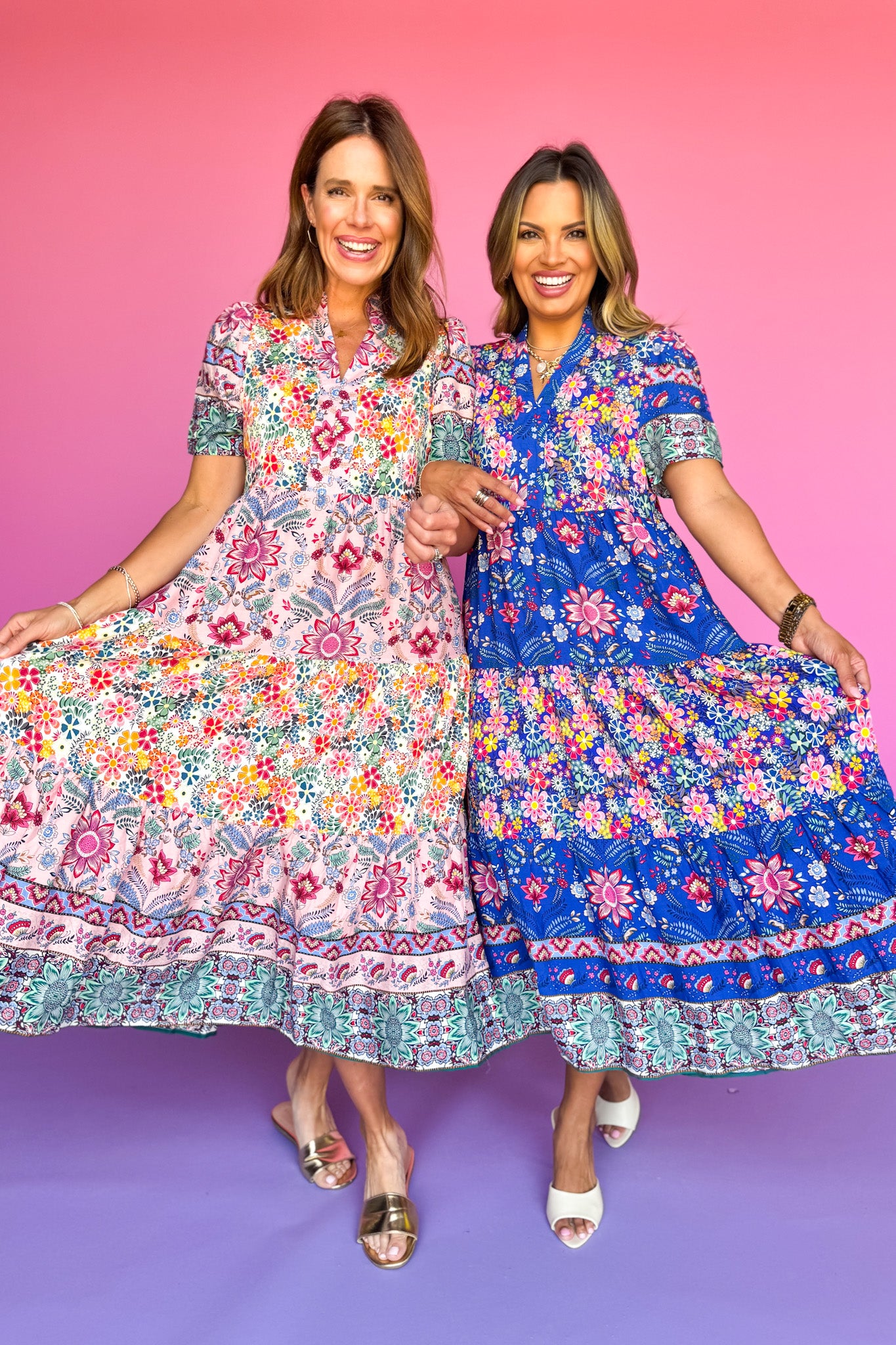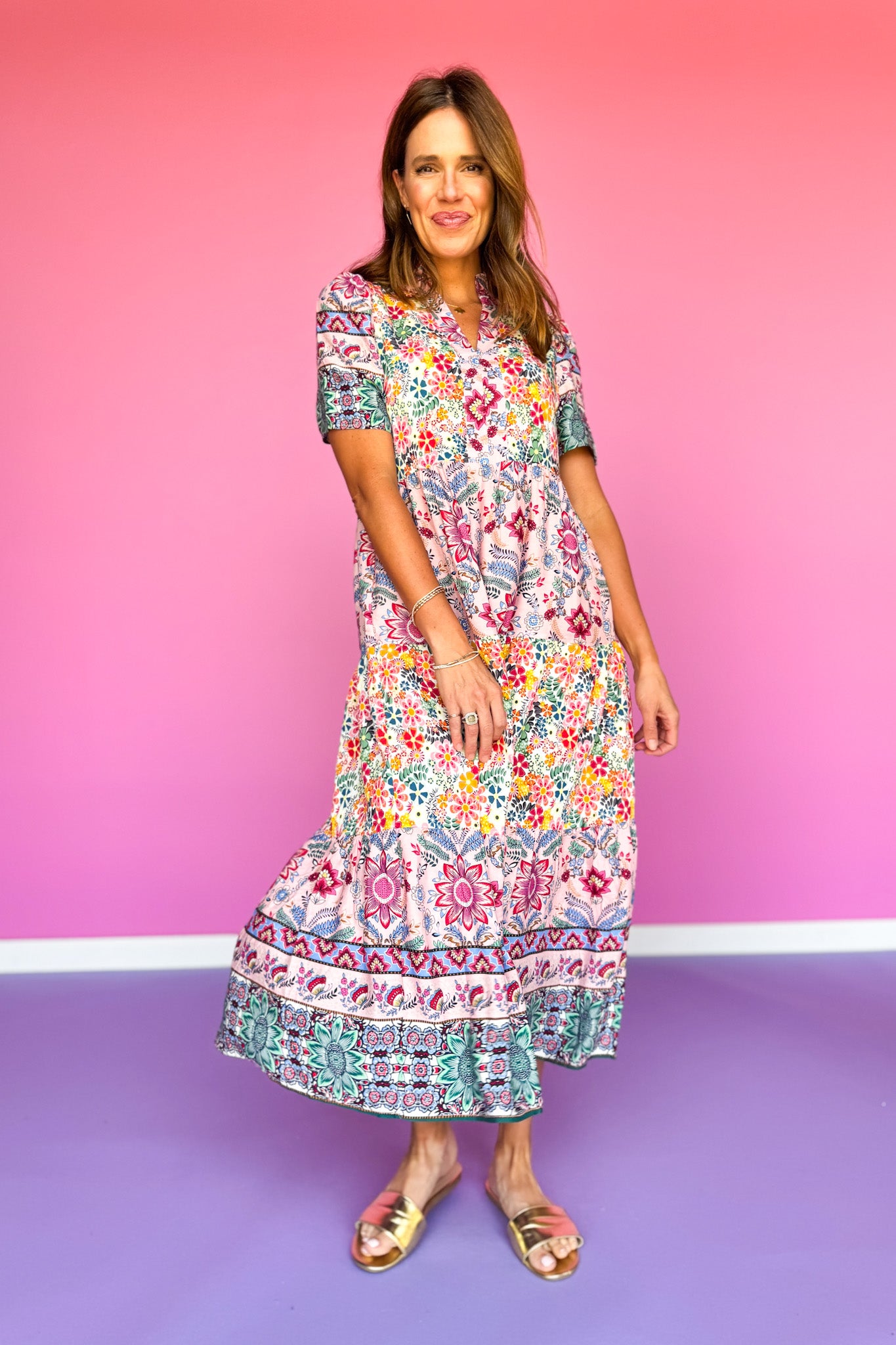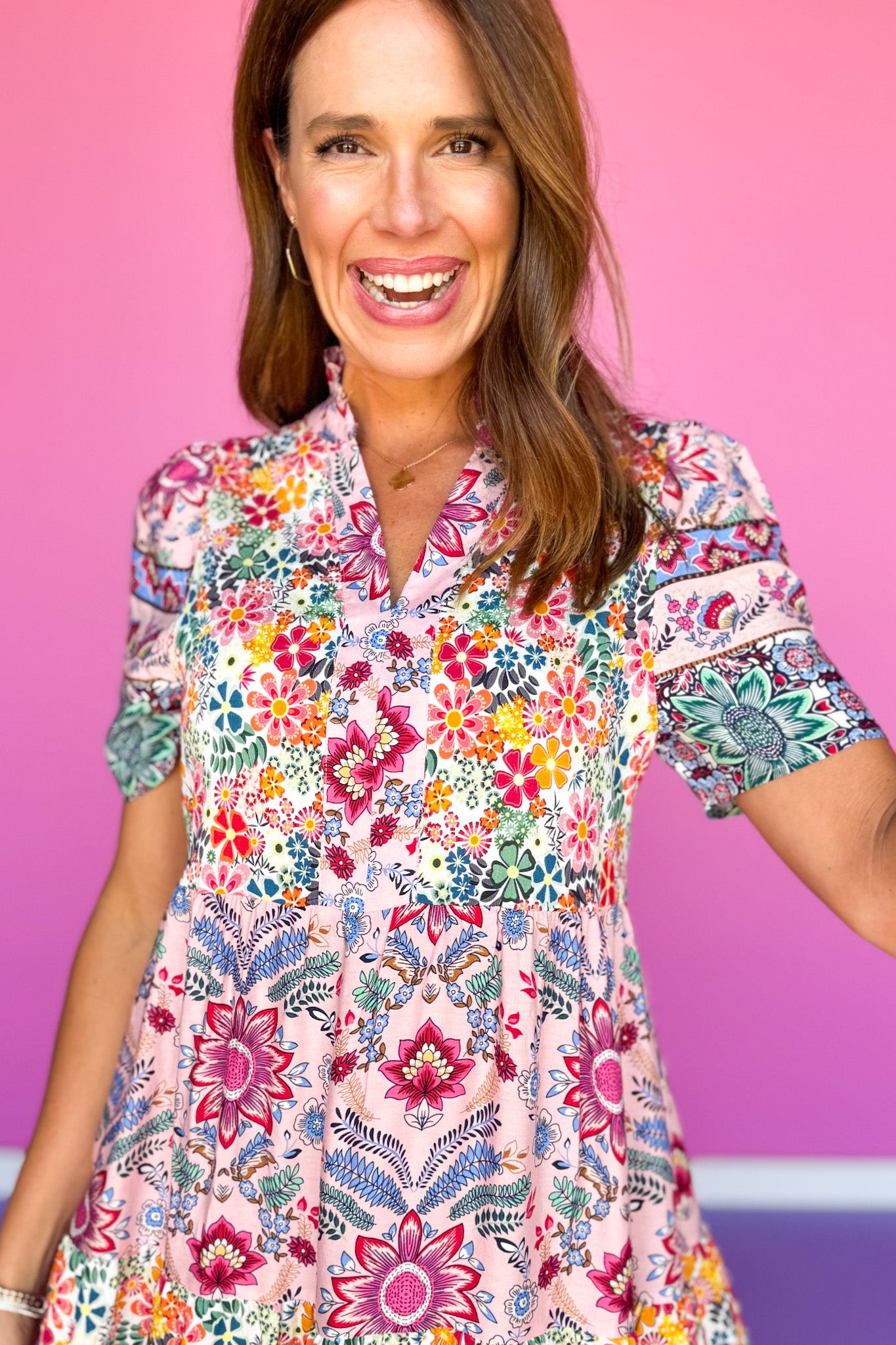 Add a touch of whimsy to your wardrobe with our Blush Mixed Print Ruffle Neck Tiered Midi Dress. With its playful mix of prints and flattering tiered construction, this dress is perfect for any occasion. Get ready to turn heads and make a statement in this colorful and effortless dress! Shop our SHOES and ACCESSORIES to polish off your look!