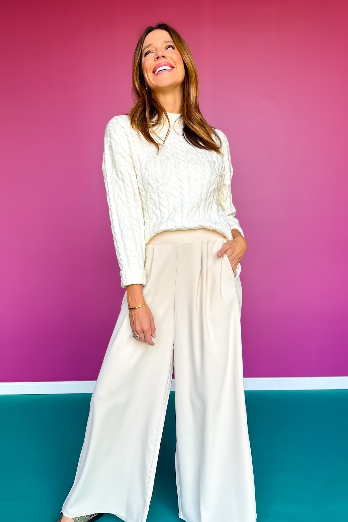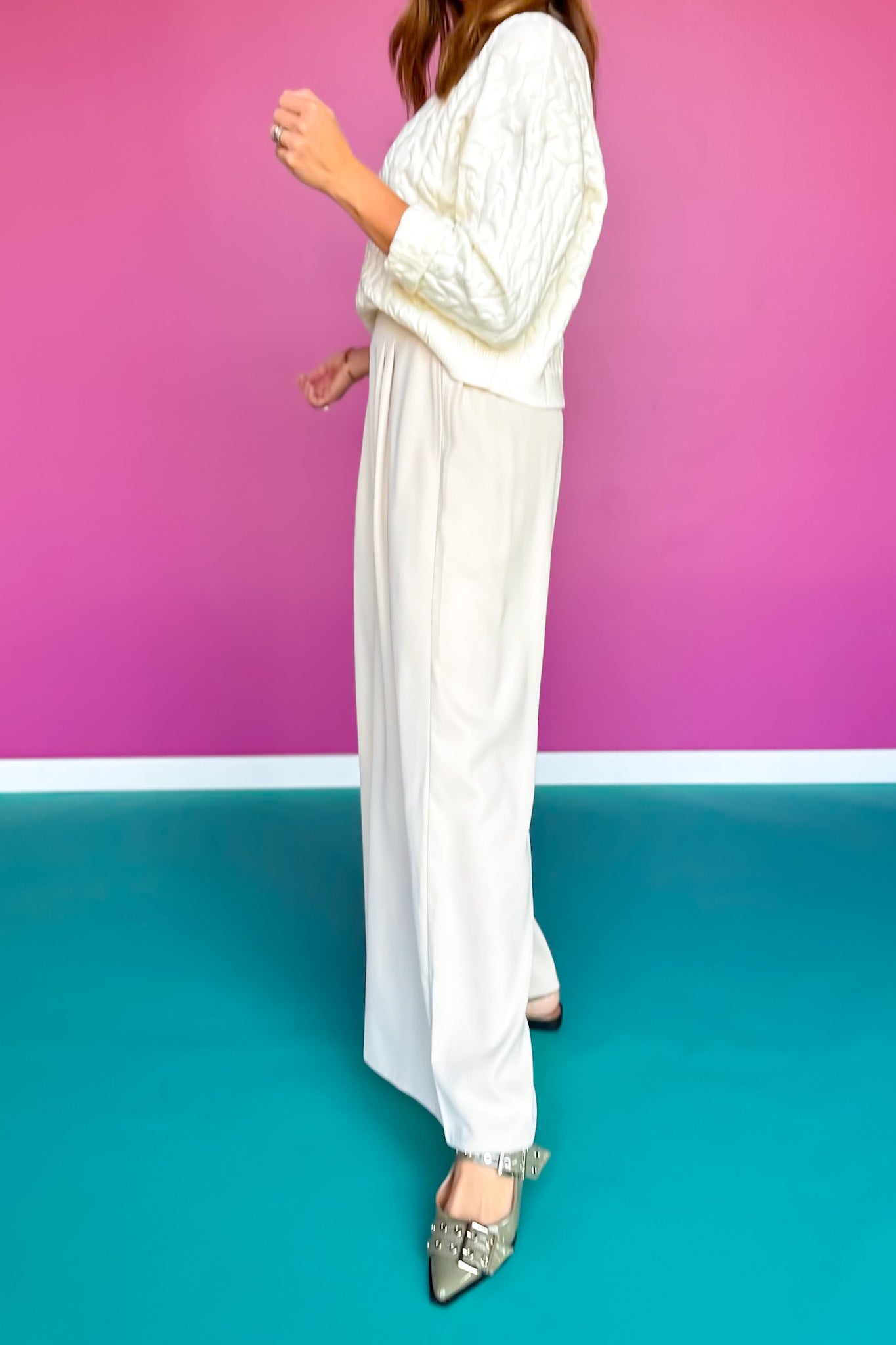 REBUILDING your CLOSET from the bottom up! Please welcome to your wardrobe the SSYS Jules Trouser Pants in Bone! This collection was thoroughly thought through to be a WARDROBE BUILDER for your closet and to make you feel polished and beautiful! SSYS Jules Trouser Pants are so easy to wear with the clean pleated front and elastic back. They will flatter all ages and body styles and the mix and match options are endless! Have fun styling out your OOTD by creating multiple combos with all the tops offered in the collection or pieces already in your closet! We love these pants styled with the SSYS Giselle Cable Knit Mock Neck Sweater In Ivory to create an ensemble that is FIERCE and POWERFUL! Whether you are going to the office, to church, to date night or girl's night, SSYS JULES is your GIRL!