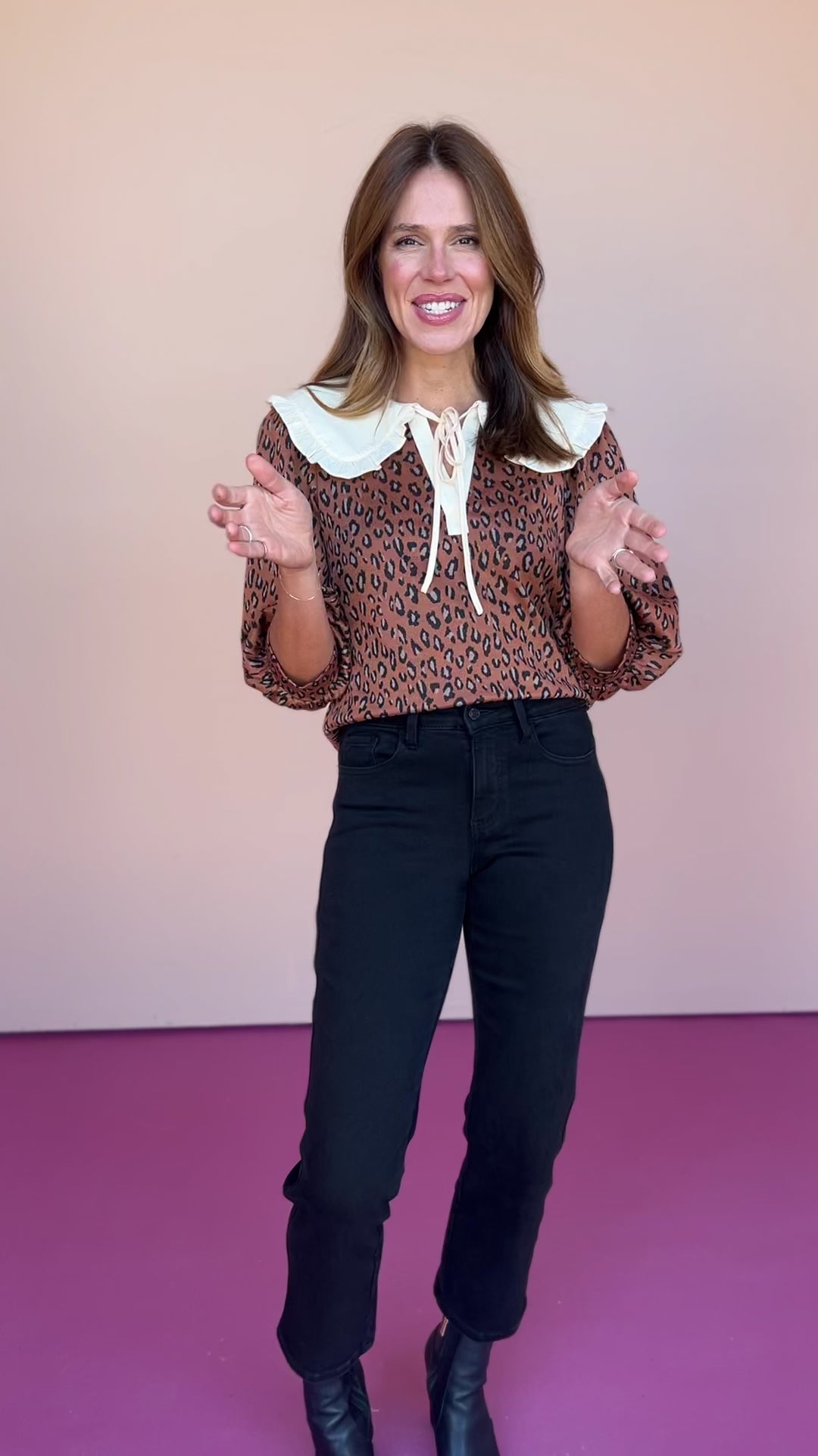 Upgrade your wardrobe with our Tan Animal Print V Neck Contrasting Collar 3/4 Sleeve Top. Stand out in style with this playful and whimsy chic top, perfect for any occasion. The tan animal print adds a fun twist to a classic V neck design while the contrasting collar adds a touch of trendy sophistication. Make a statement with this unique and eye-catching top we are all obsessing over! Shop our DENIM and SHOES to build your look and create major fashion envy!