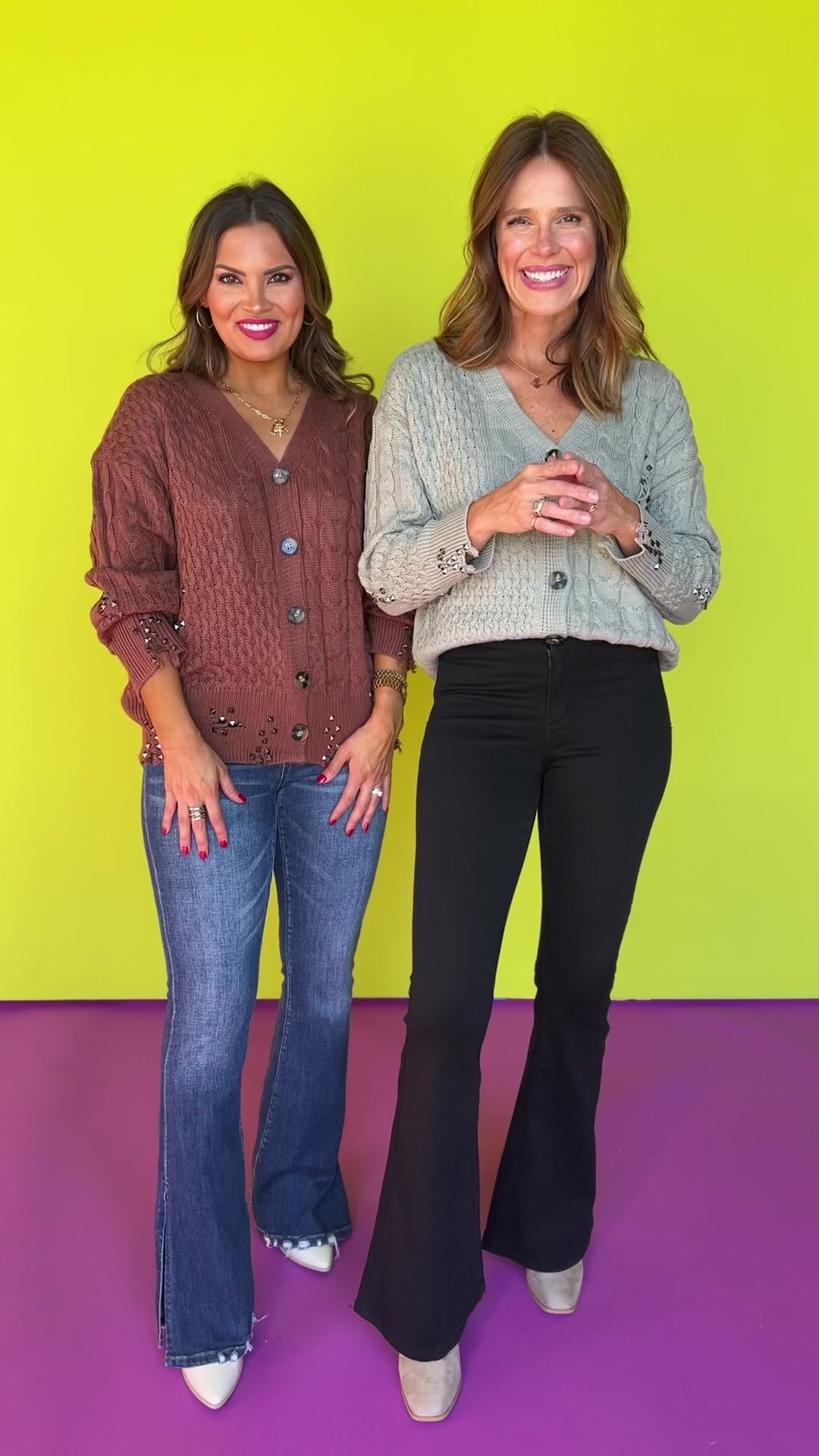 Edgy layering piece coming at you with our Brown Cable Knit Distressed Stud Embellished Cardigan! This cardigan features a rustic brown cable knit design, edgy distressed detailing, and eye-catching stud embellishments. Perfect for adding a touch of edgy trend to any outfit. Style with your favorite denim and sneakers to run errands in style! Shop our DENIM and SHOES to build your ensemble!