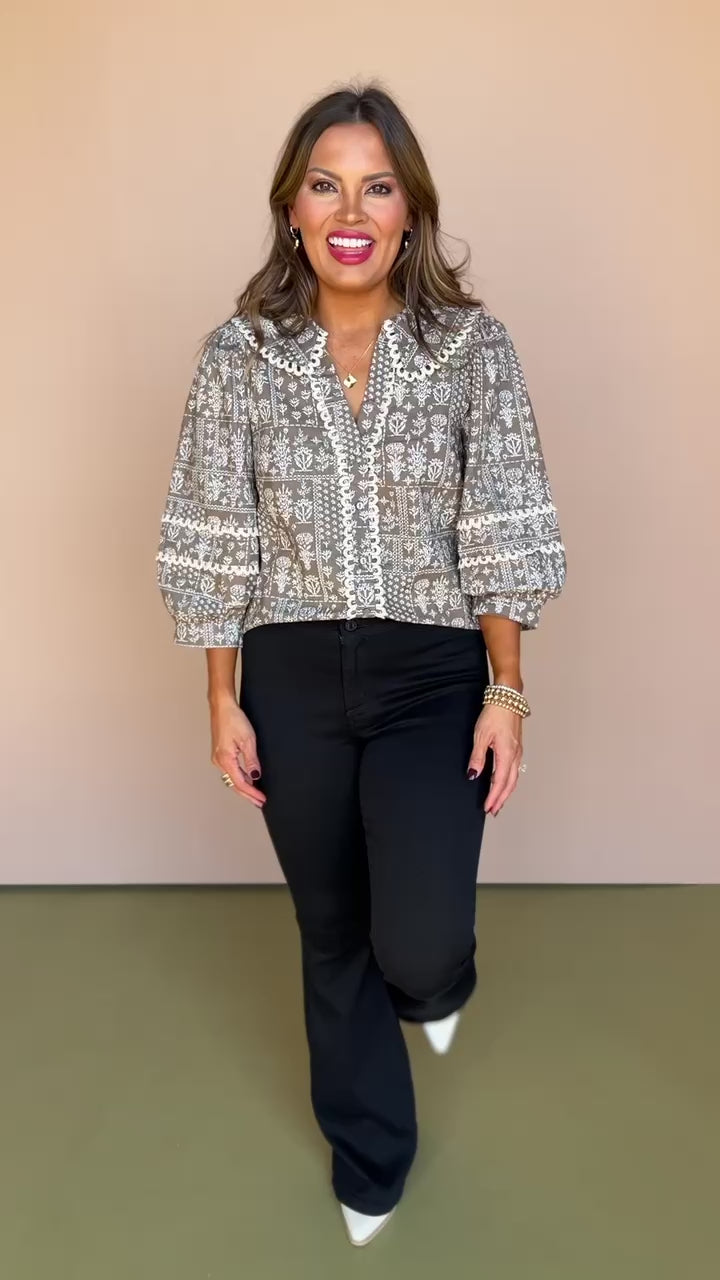 Add a touch of flair to your wardrobe with our Brown Printed Top. With charming scallop trim details and a classic button-up collar, this 3/4 sleeve top is perfect for any occasion. Unique and stylish, it's a must-have addition to your collection. Style with parchment flares and boots and be oh so chic wherever the day takes you! Shop our DENIM and SHOES to polish off your look!