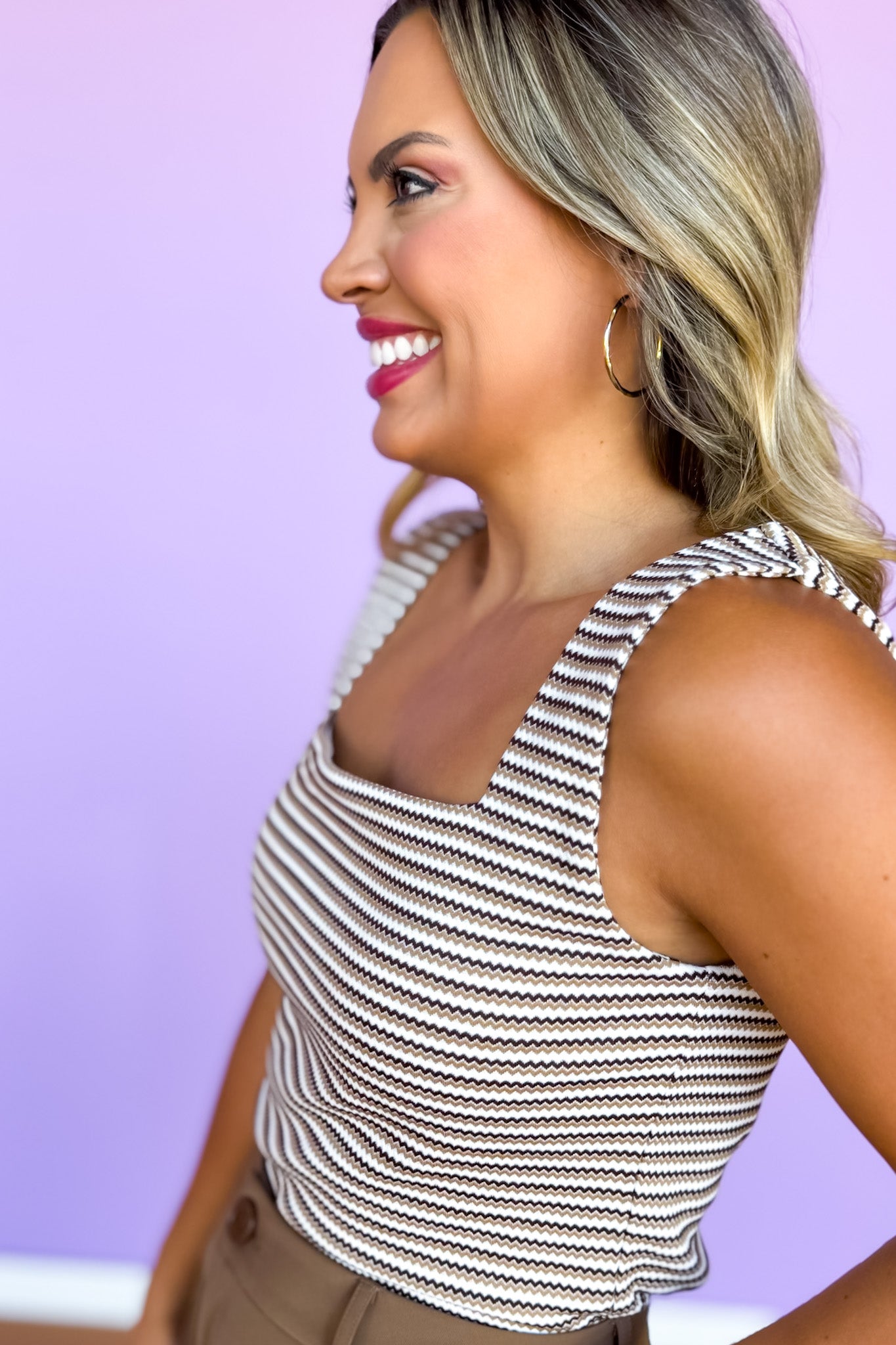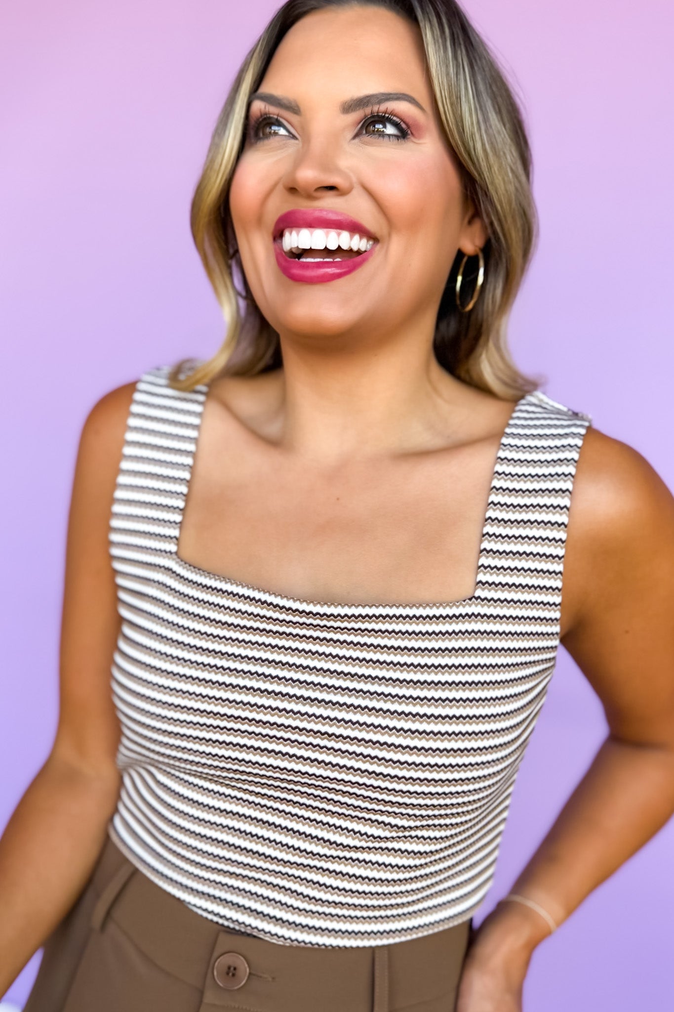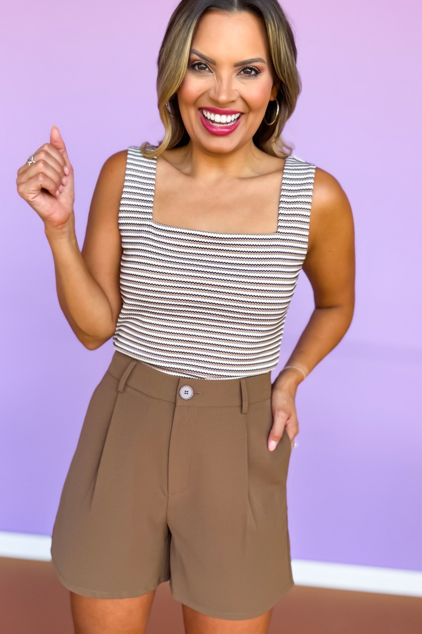 Elevate your everyday basics with the SSYS Brown Zig Zag Ribbed Square Neck Padded Tank. Designed with a flattering square neckline and built-in padding for light support, this women’s square neck top features a textured zig zag ribbed knit that adds subtle dimension to its fitted silhouette. The rich brown stripes pair effortlessly with denim, skirts, or tailored trousers, making it a versatile layer or standout piece on its own. Style with our SSYS Jules Trouser Shorts In Chocolate for a boho chic OOTD!