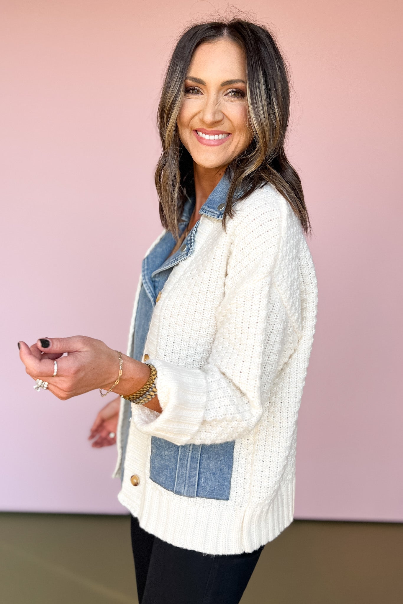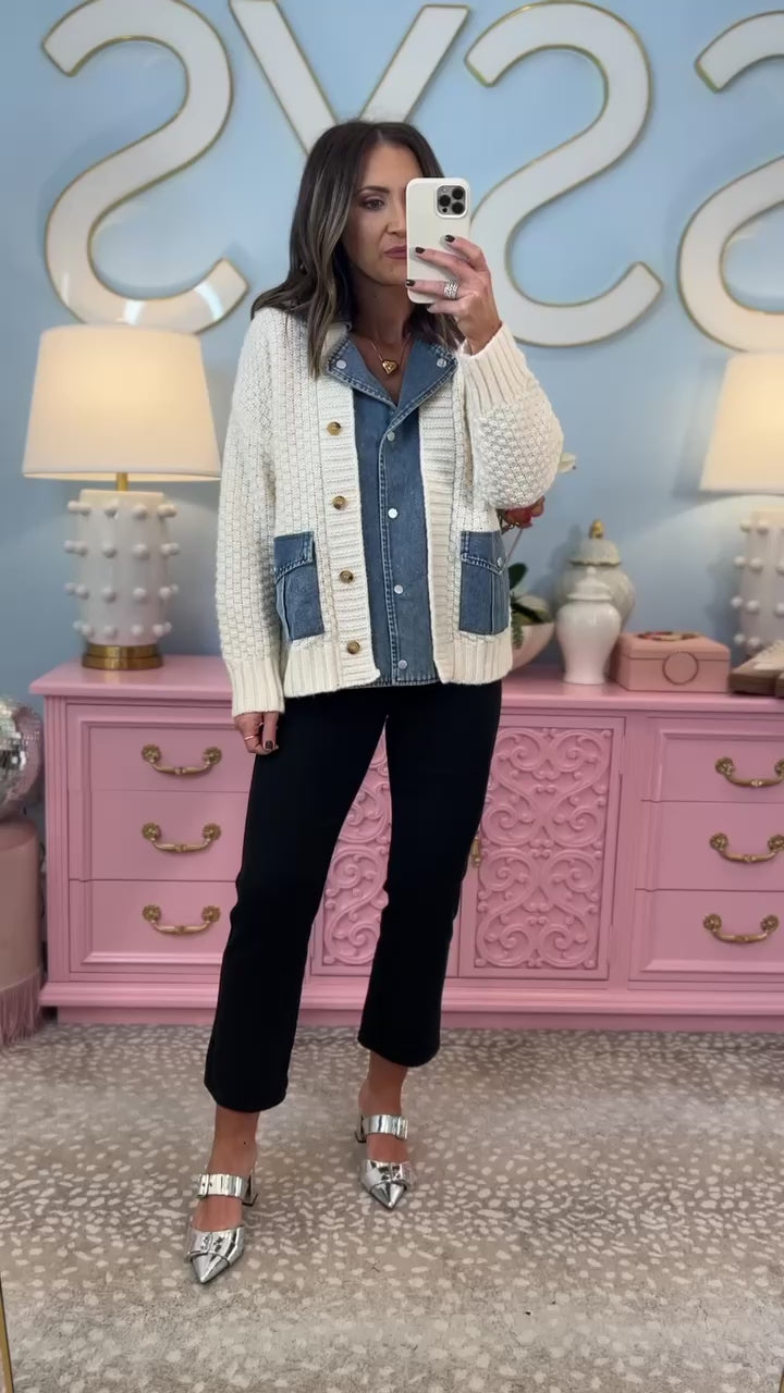 Wrap yourself up in style with our Cream Faux Snap Denim Detail Sweater Cardigan! This versatile piece combines comfort and fashion, with its cozy knit material and unique denim-inspired accents. Add it to your wardrobe for a playful twist on a classic look. Wear as a stand alone piece with denim or layer over a poplin, so CHIC! Shop our TOPS and BOTTOMS to complete your ensemble!