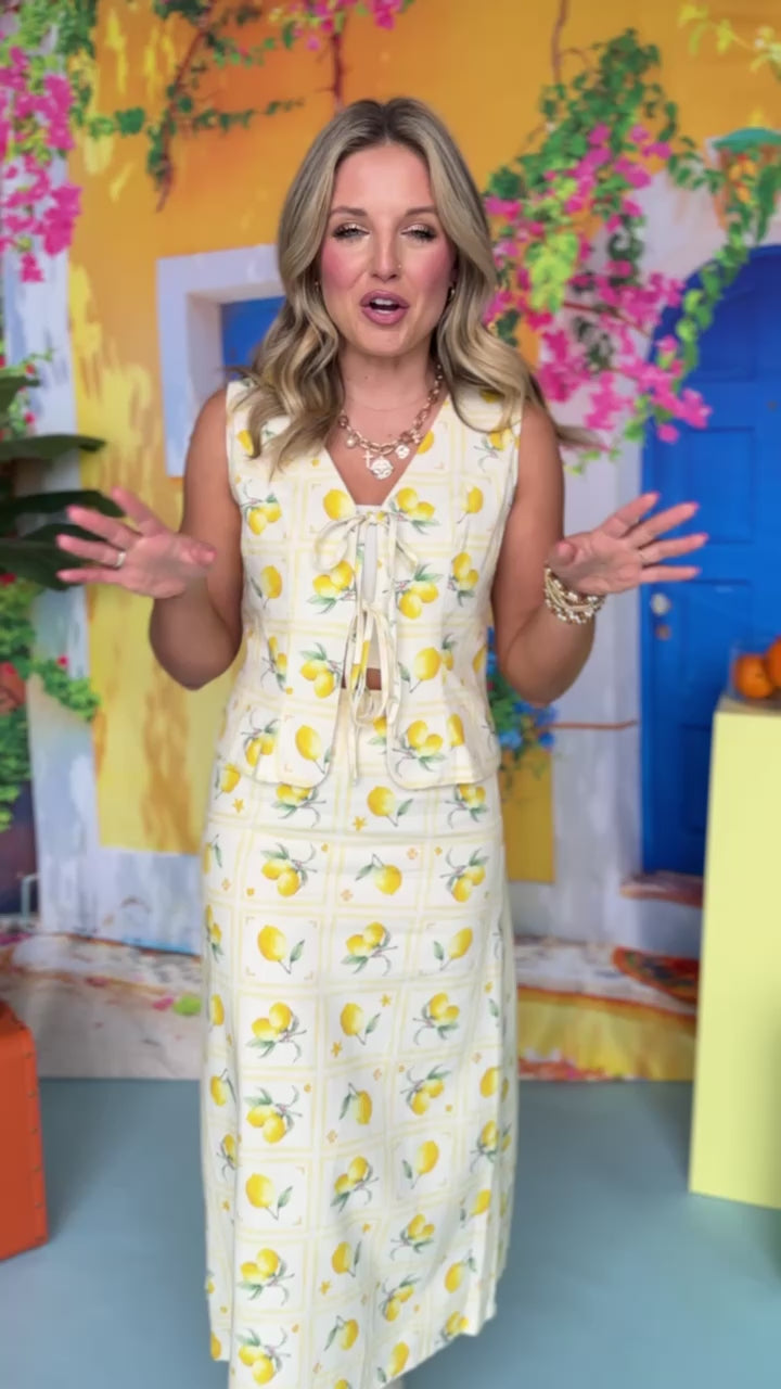 Cream Lemon Print Front Bow Tie Top Midi Skirt Set *FINAL SALE*