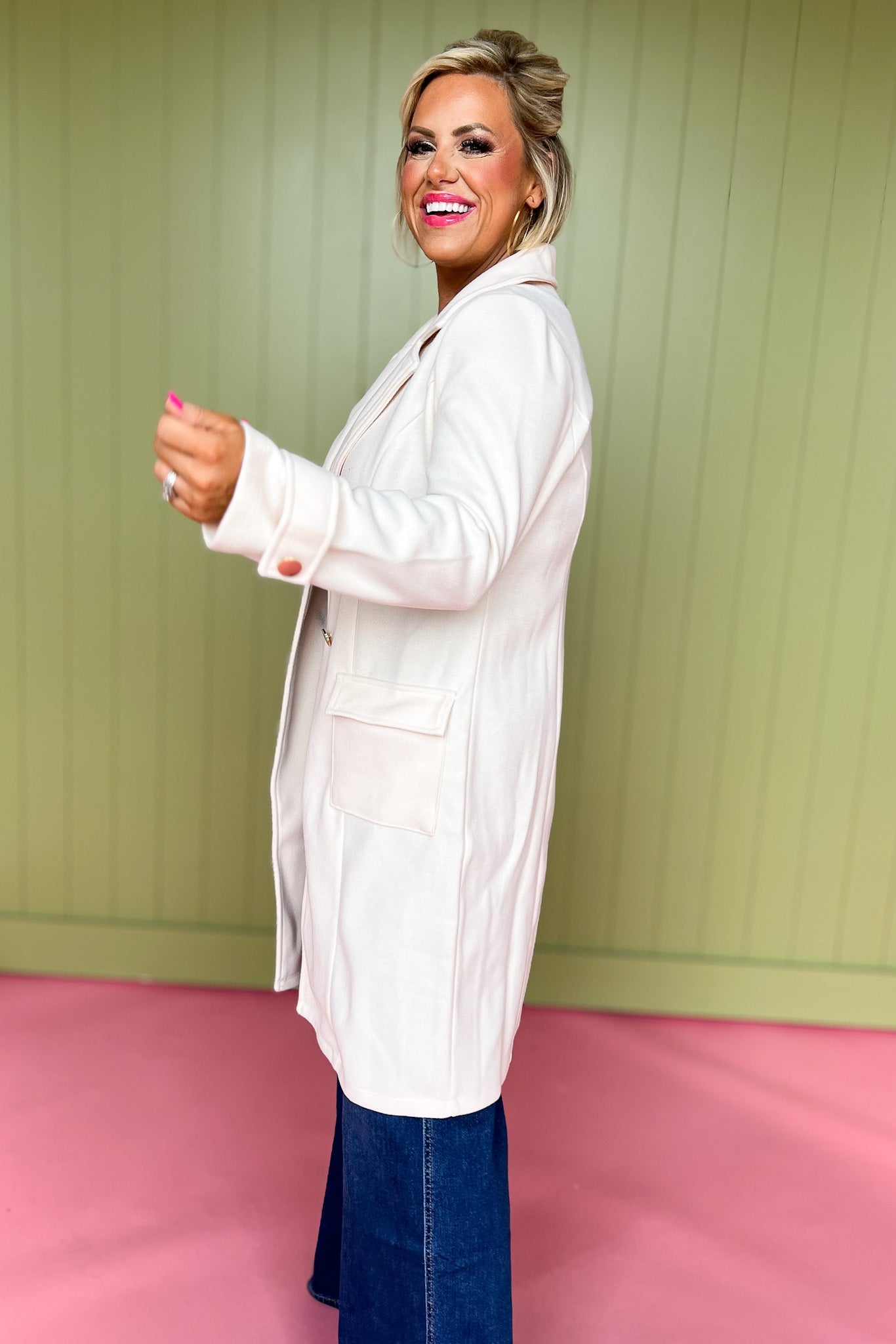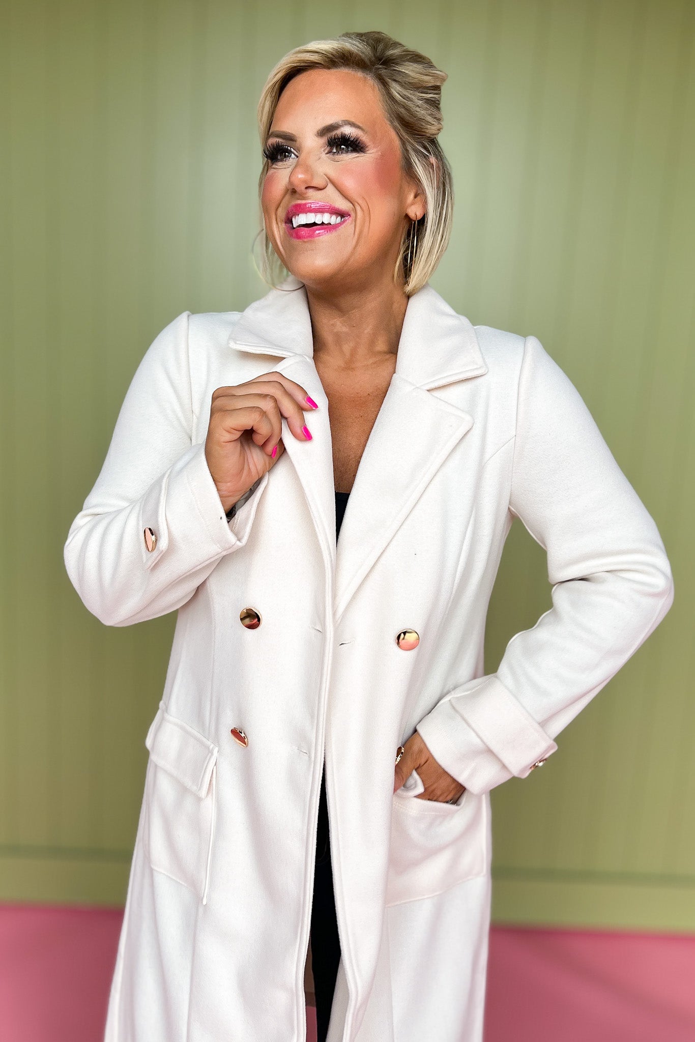 Introducing our Cream Woven Double Breast Coat--the perfect blend of classic style and function. This essential coat will keep you warm and looking sophisticated chic. With its double breast design, it's a trendy yet timeless addition to any wardrobe. Stay cozy and fashionable this season!