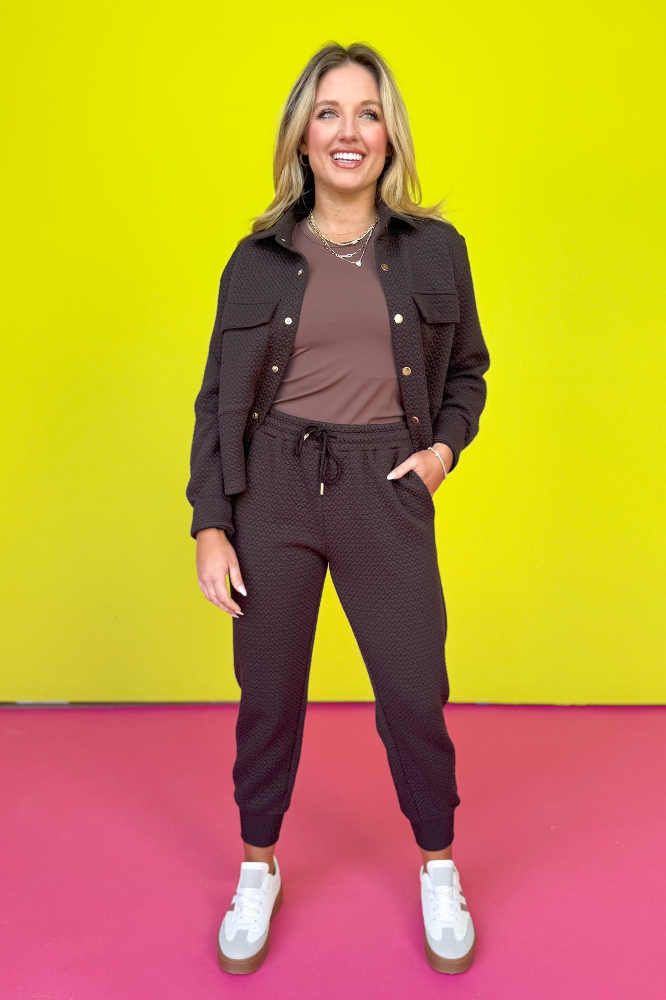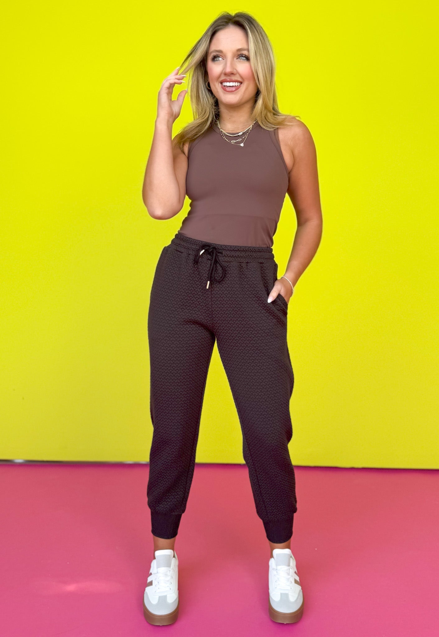 DOESN'T GET BETTER THEN THIS! Introducing the SSYS Tyler Diamond Quilted Dark Brown Joggers!!! The response to the original SSYS Tyler Shacket was through the roof, so we had to bring it back in an updated form and add to the play! Y'all loved our signature diamond quilted fabric as much as we do, so why not make it into joggers?! Perfectly designed to pair with the matching SSYS Tyler Cropped Diamond Quilted Dark Brown Shacket to make a chic set, but don't stop there! The styling options are flexible and endless! You know and love the SSYS Tyler, so add to the play and the possibilities are ENDLESS!
