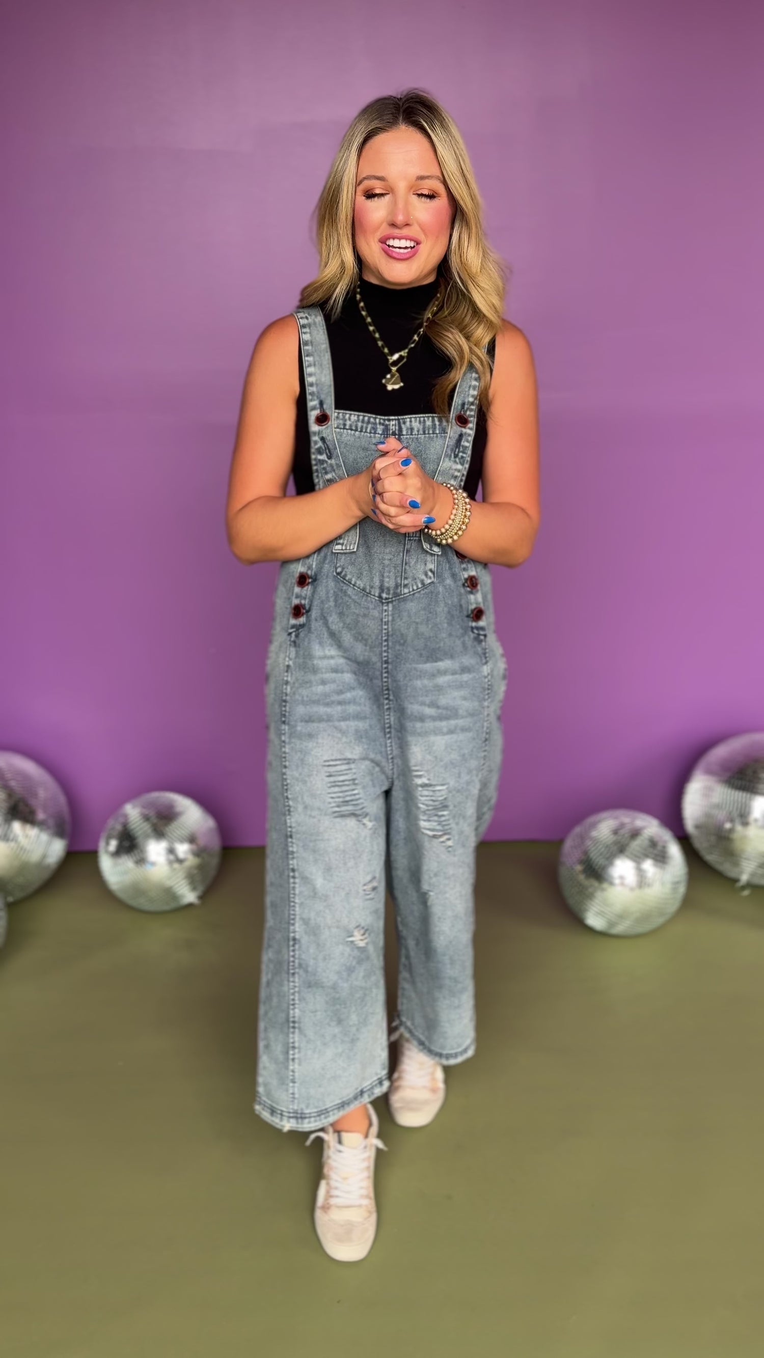 Add some edge to your wardrobe with our Denim Distressed Button Detail Wide Leg Jumpsuit. This jumpsuit features a unique distressed denim design and button details, perfect for any fashion-forward individual. Step out in style with this versatile and playful piece that is sure to create fashion envy wherever you go! Style with a solid fitted top and sneakers and get ready for the compliments! Shop our in stock and versatile collection of TOPS and SHOES to polish off your look!