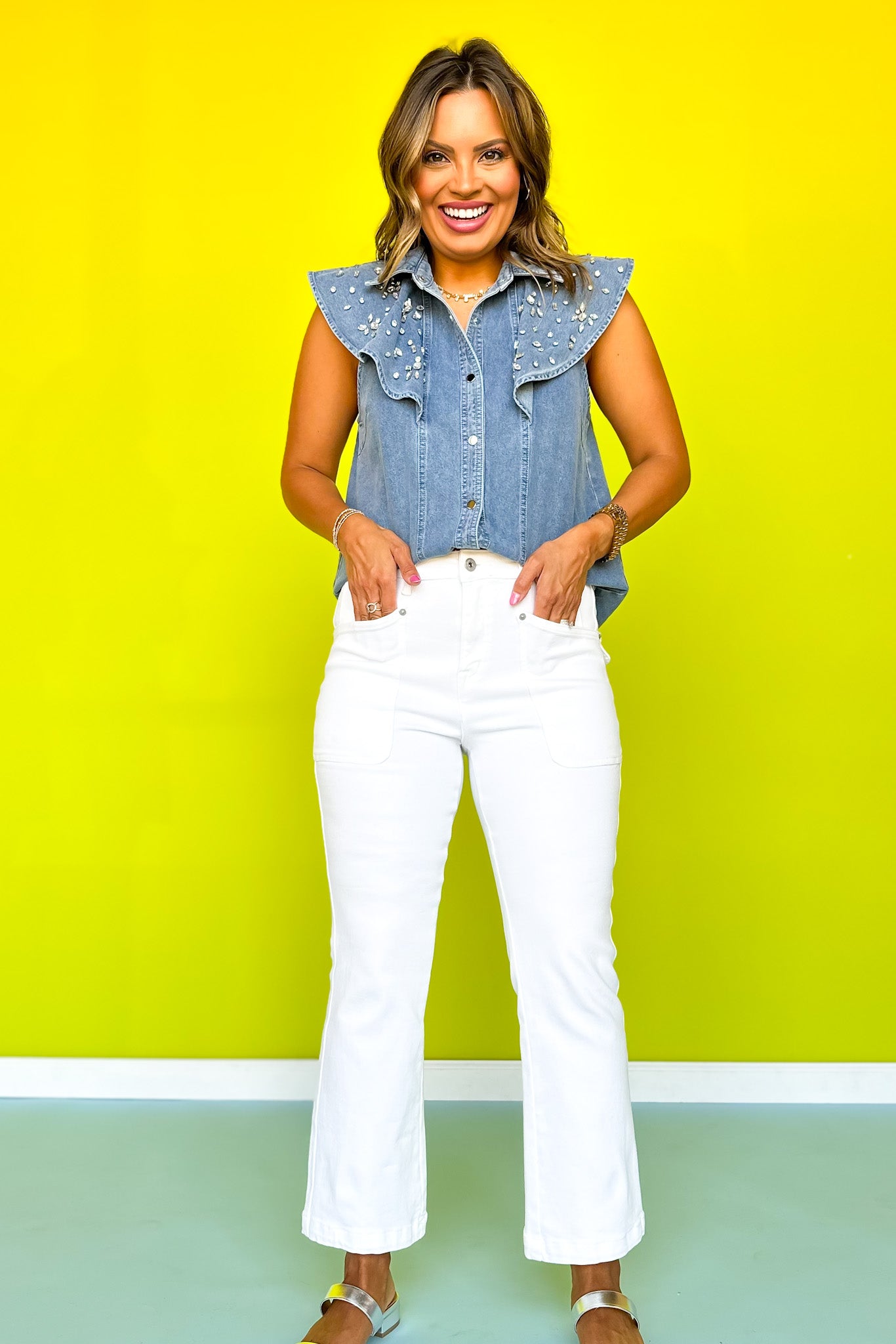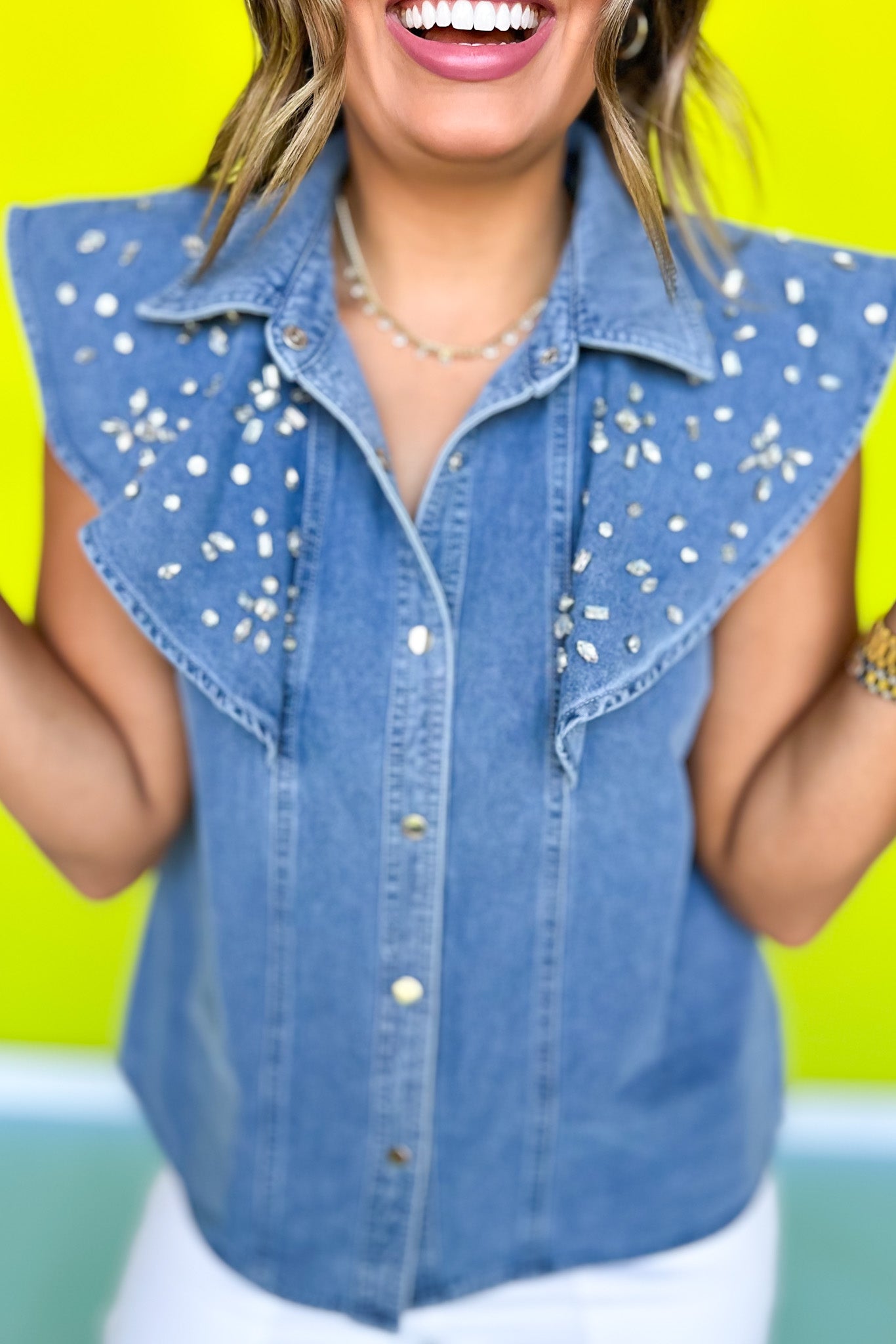 Add some sparkle to your wardrobe with this fun Denim Rhinestone Embellished Flutter Sleeve Top! The flutter sleeves dance with your every move, while twinkling rhinestones catch the light (and compliments). This playful piece effortlessly jazzes up your favorite jeans or shorts. Shop our BOTTOMS and SHOES to build your FAB ensemble!
