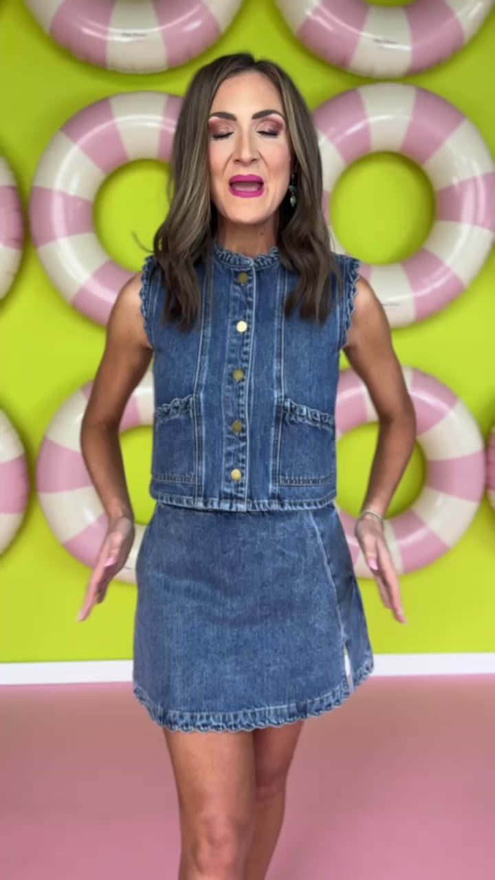Possibly, Mallory's FAVORITE of the collection! Introducing the SSYS Paisley Scallop Trim Denim Vest Skort Set! The details are a 10/10! Together has a set, Paisley is FEMININE and has a TOP NOTCH fit, but she can also be broken up to be so functional in your closet. Paisley's skort will be your most worn skort of the season! It's easy, it's cute, has shorts under it to allow you to do just about whatever you need in it. Paisley's top is just as good and functional allowing you to style with multiple pieces already in your closet. SSYS Paisley is STYLE to the MAX! Shop our SHOES and ACCESSORIES to polish off your look!