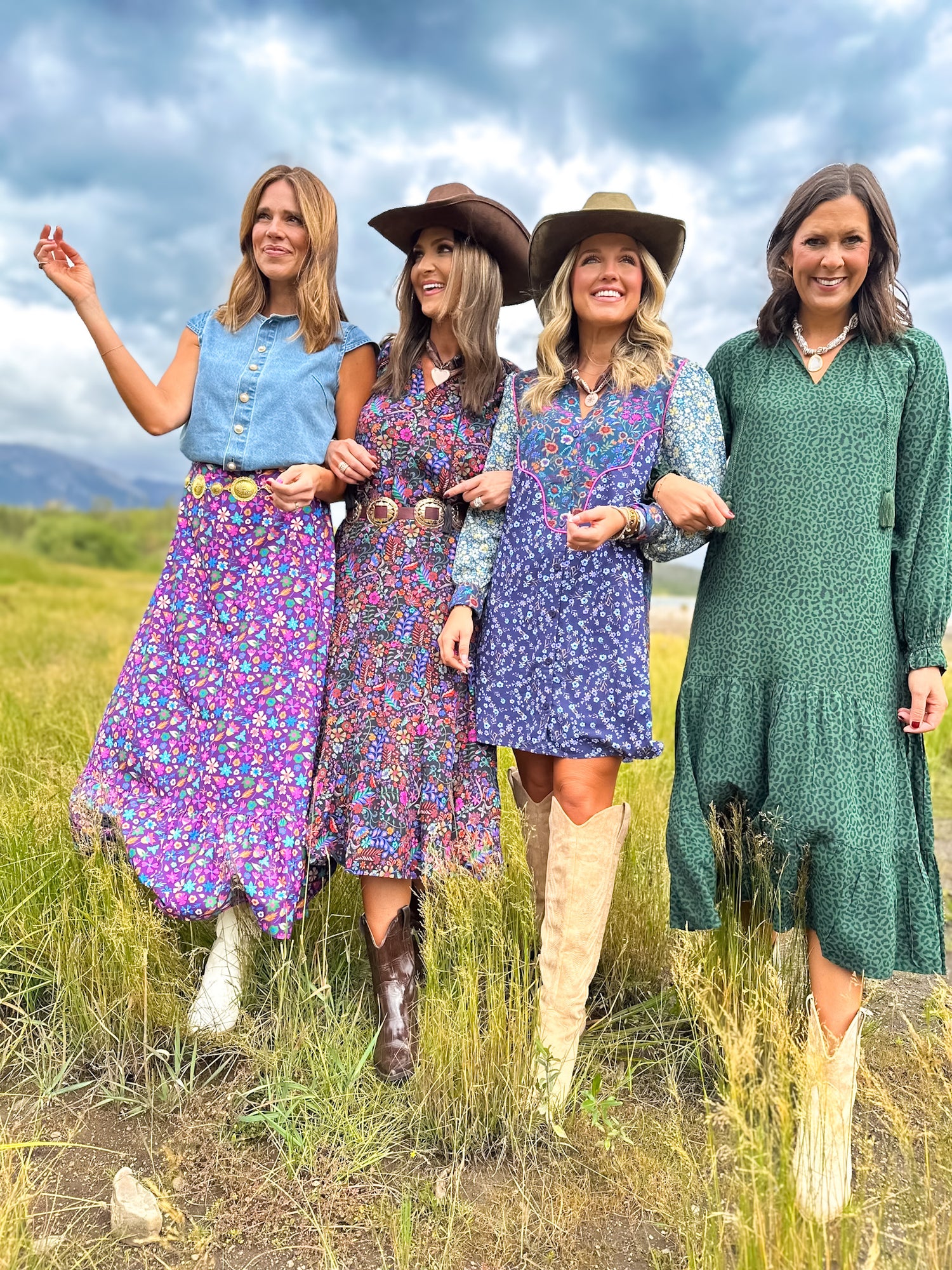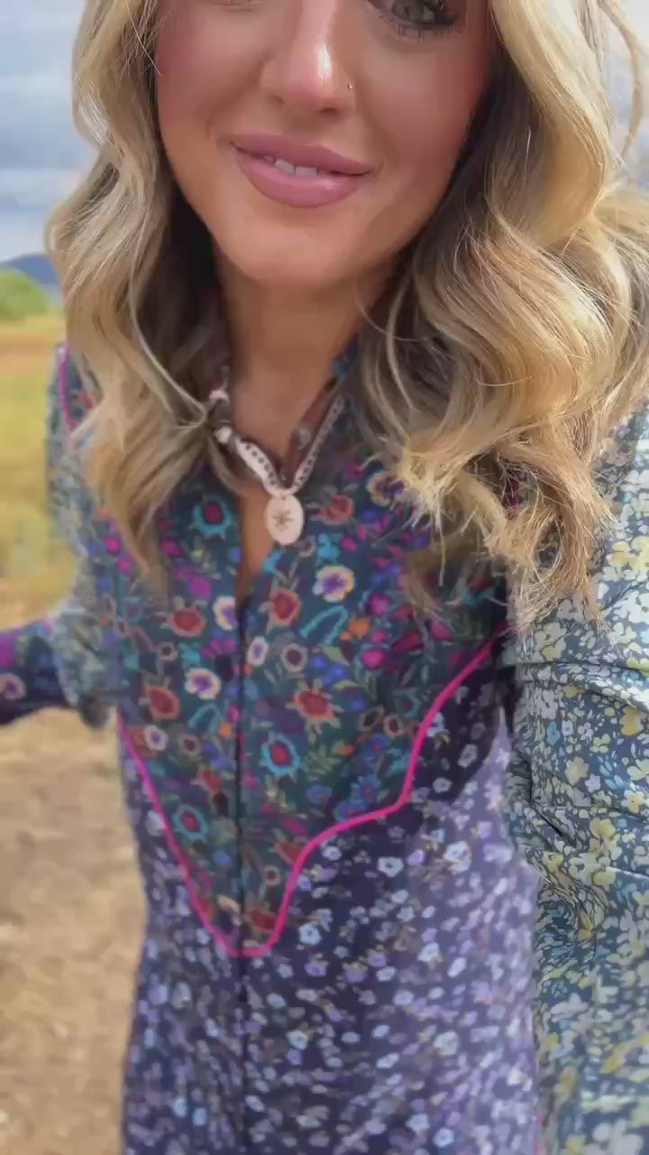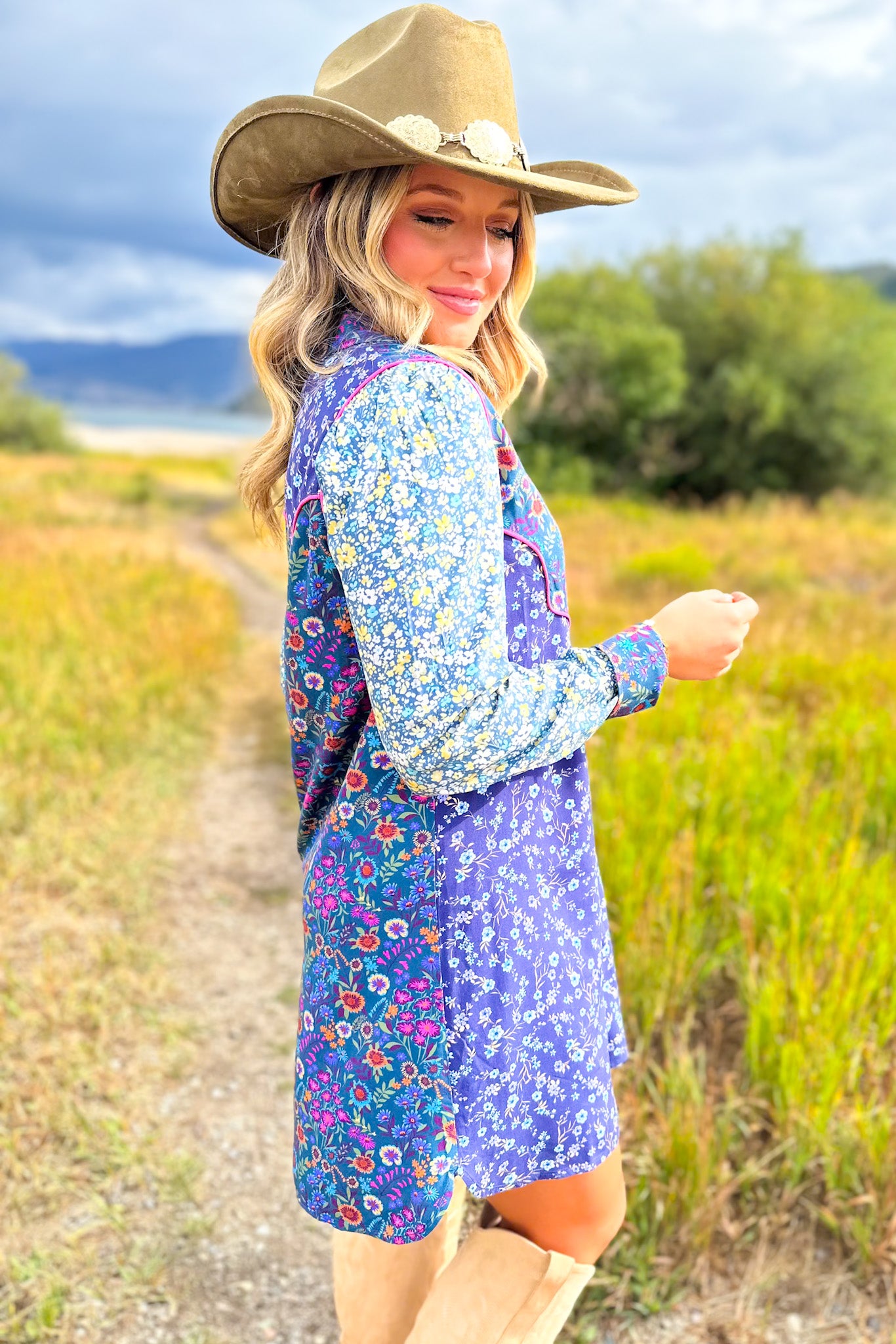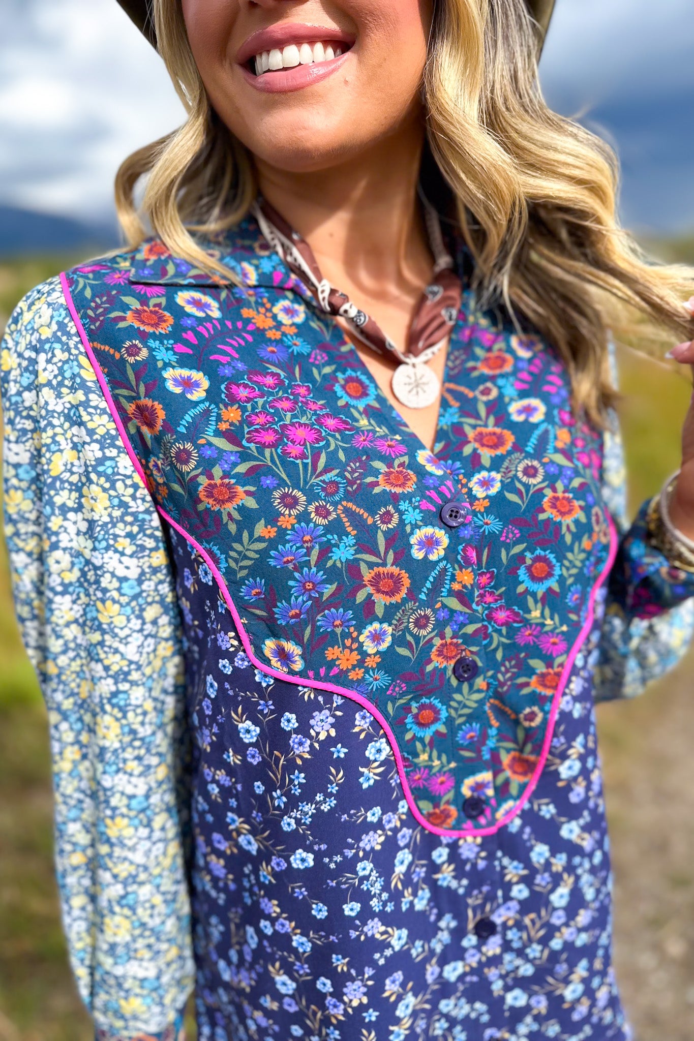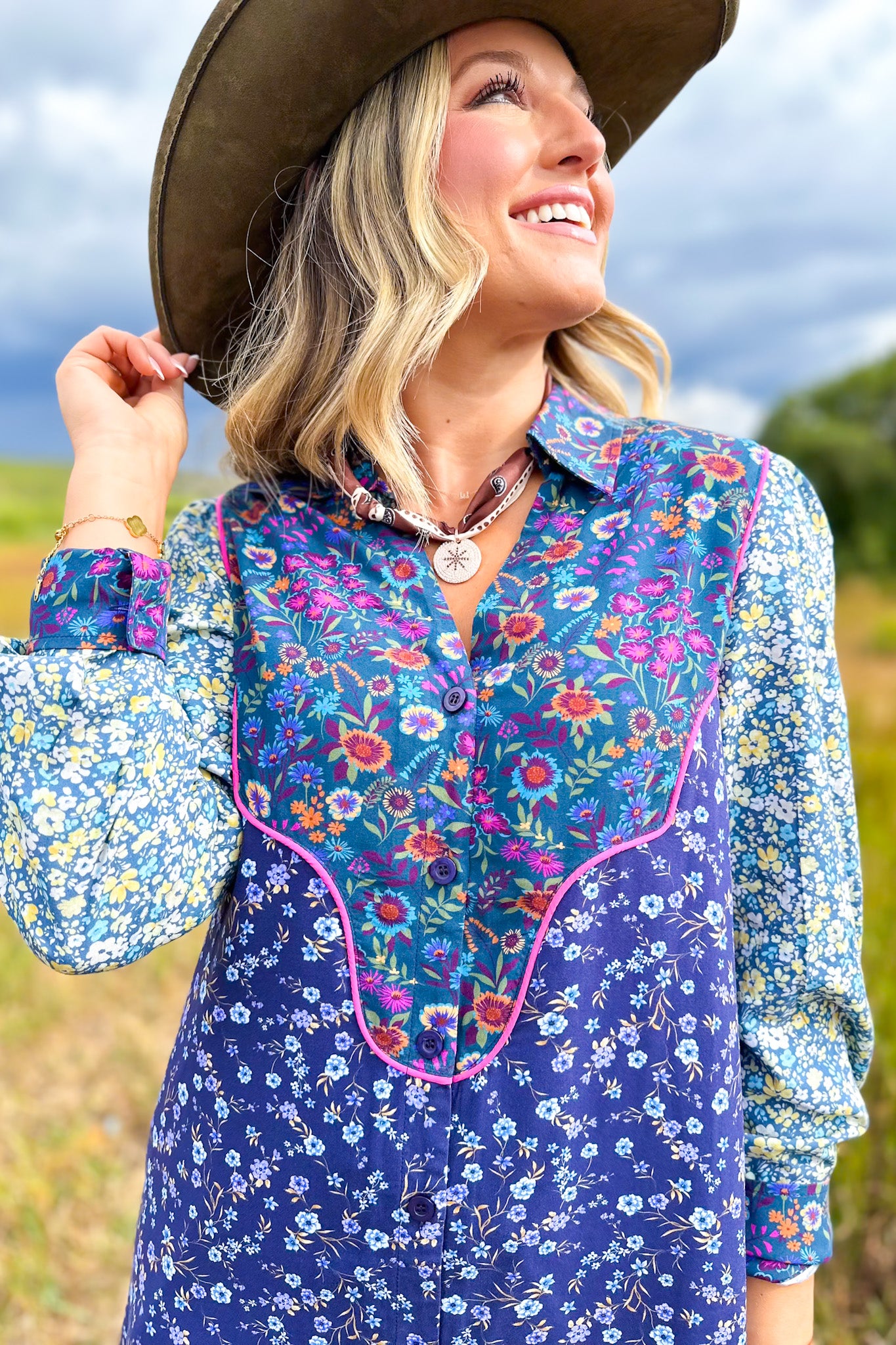 Playful prints and effortless charm define the Livvy Mix Print Dress in Floral by SSYS The Label. This eye-catching dress features a patchwork of floral patterns in shades of blue, teal, and pink, accented with contrast piping for a polished finish. With its relaxed silhouette, button-front detail, and long sleeves, it’s the perfect mix of boho-chic and western-inspired style.
