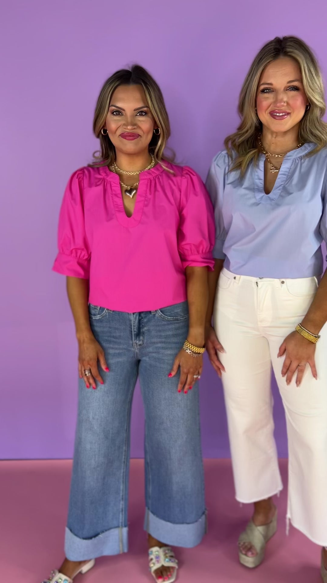 Upgrade your wardrobe with the Fuchsia 3/4 Puff Sleeve Split Cuff Top! This top features playful, puff sleeves and a unique split cuff design, adding a touch of uniqueness to any outfit. Perfect for a versatile and stylish look, this top is a must-have for your wardrobe! Style with denim and sneakers or elevate by pairing with trousers and heels for the workplace! Shop our BOTTOMS and SHOES to complete your ensemble!