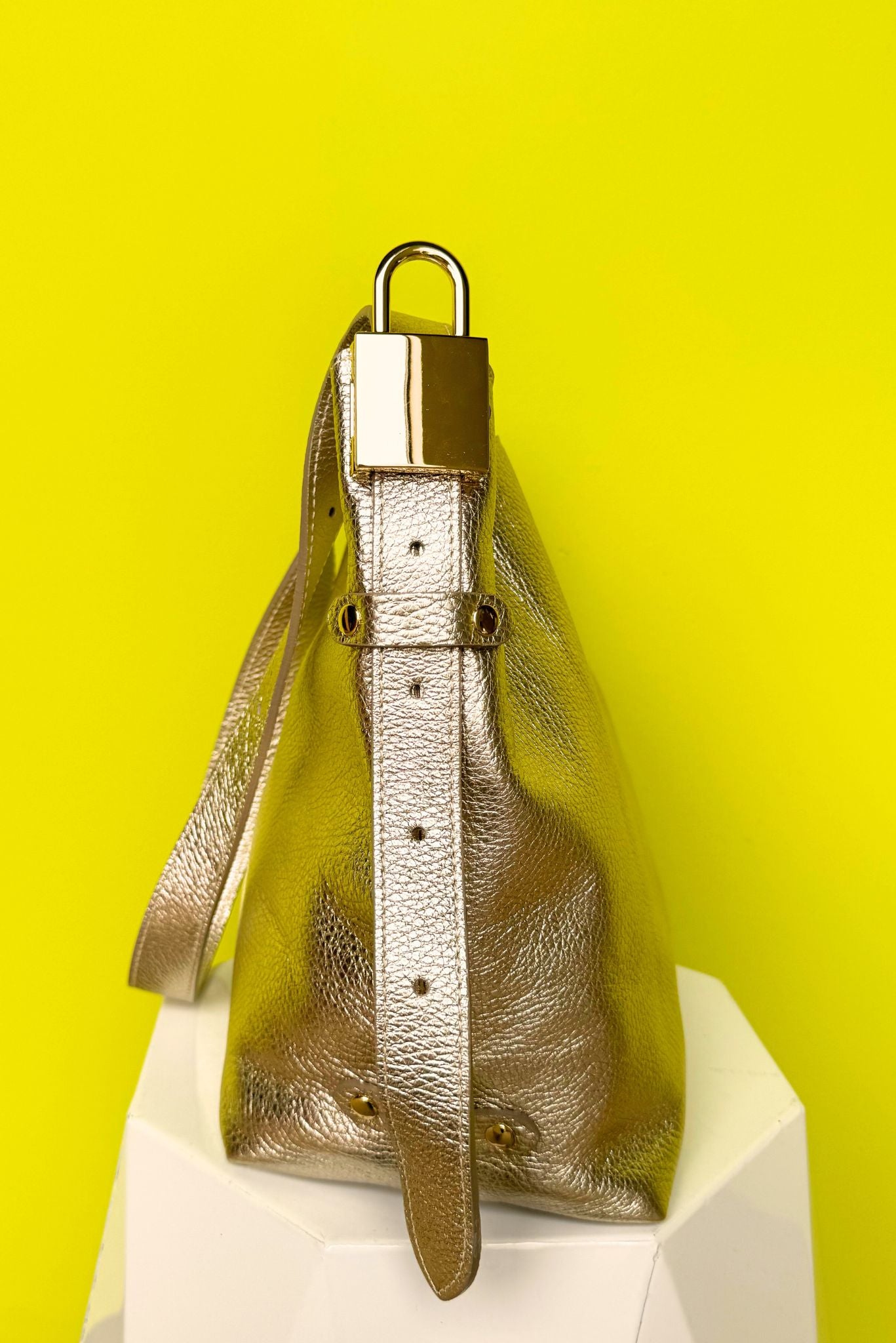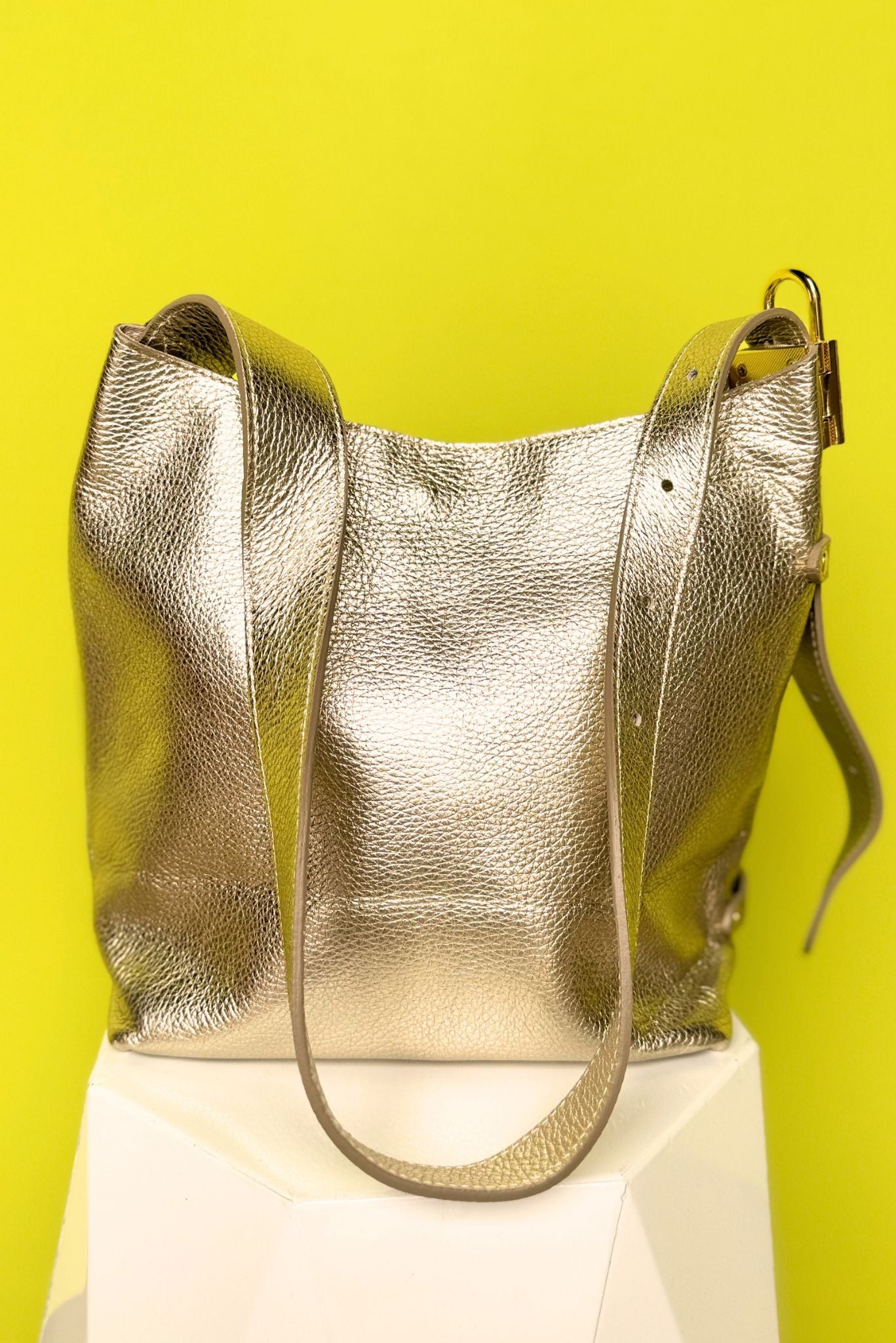 We are OBSESSED! Get ready to add some pizzazz to your outfit with our Gold Metallic Buckle Detail Tote Purse. The side gold buckle and metallic sheen add a touch of glamour, while the roomy size makes it perfect for storing all your essentials. Made from genuine leather and made in Italy, this will be a special and long lasting addition to your wardrobe. Make a statement with this trendy and functional tote!