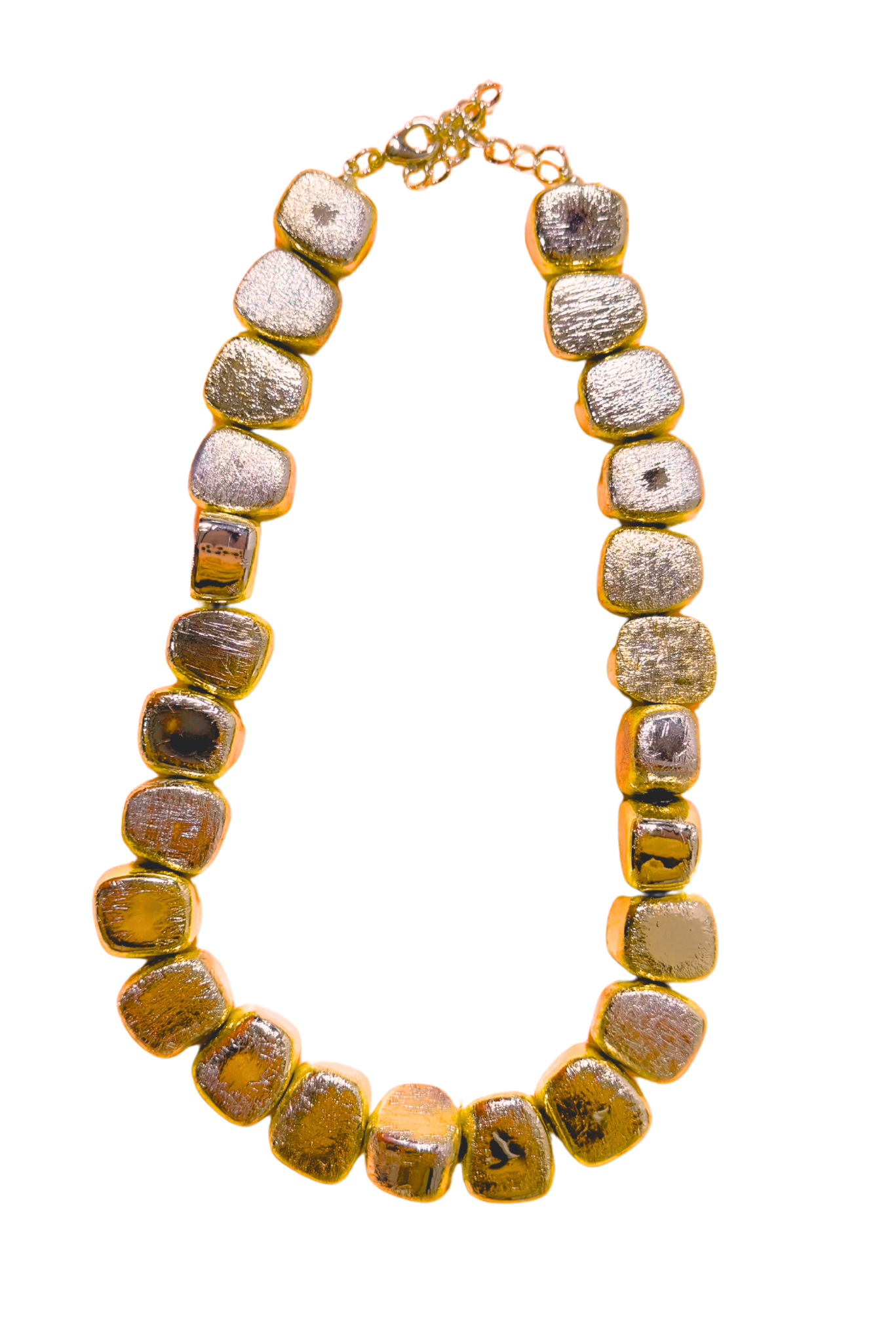 Add a touch of shine and fun to your look with this Gold Textured Beaded Necklace. Its shimmering beads catch the light just right, making every outfit pop with playful charm. Perfect for dressing up or adding a little glam to your everyday style!