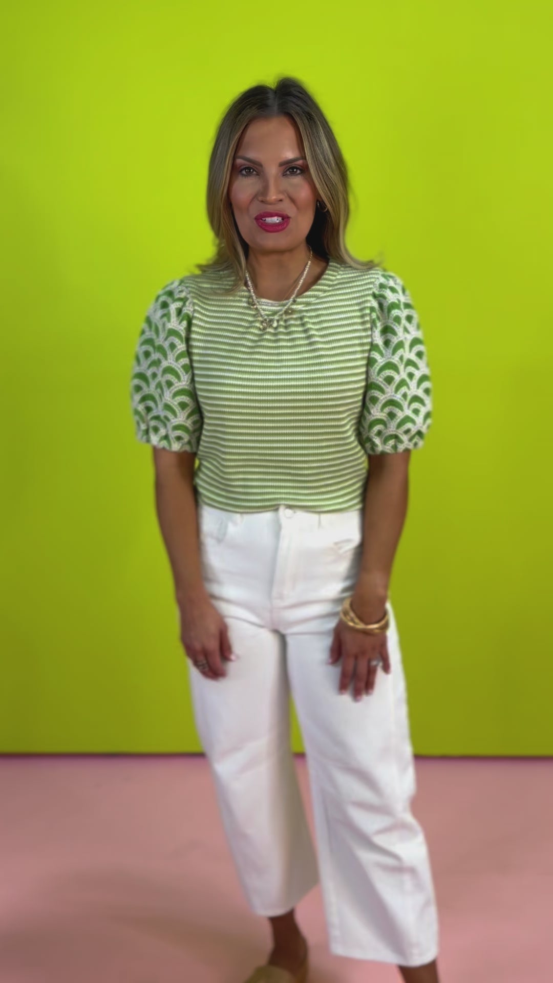Green Embroidered Scallop Sleeve Stripe Top *FINAL SALE*