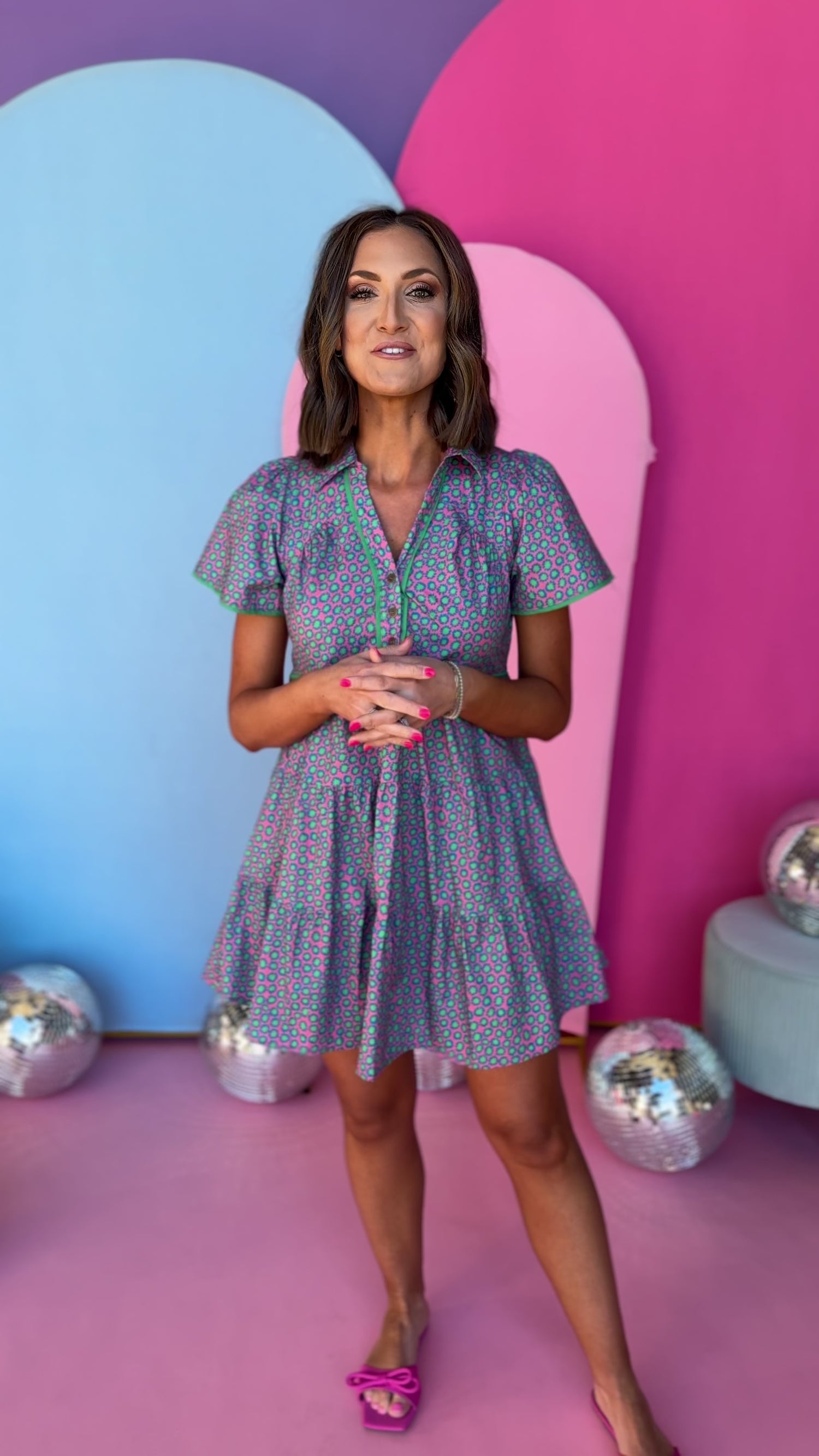 We are obsessed with this gorgeous dress! It features a green floral print, V-neckline, and contrast piping! It truly is the perfect addition to a sunny day wardrobe; this fabulous dress is sure to add a playful pop of color to any look! Pair it back to your go-to sandals and denim jacket!