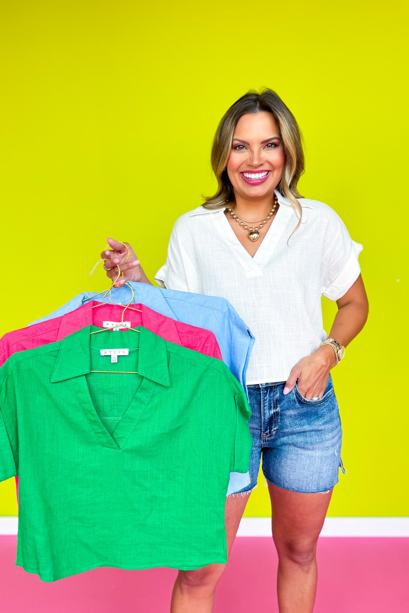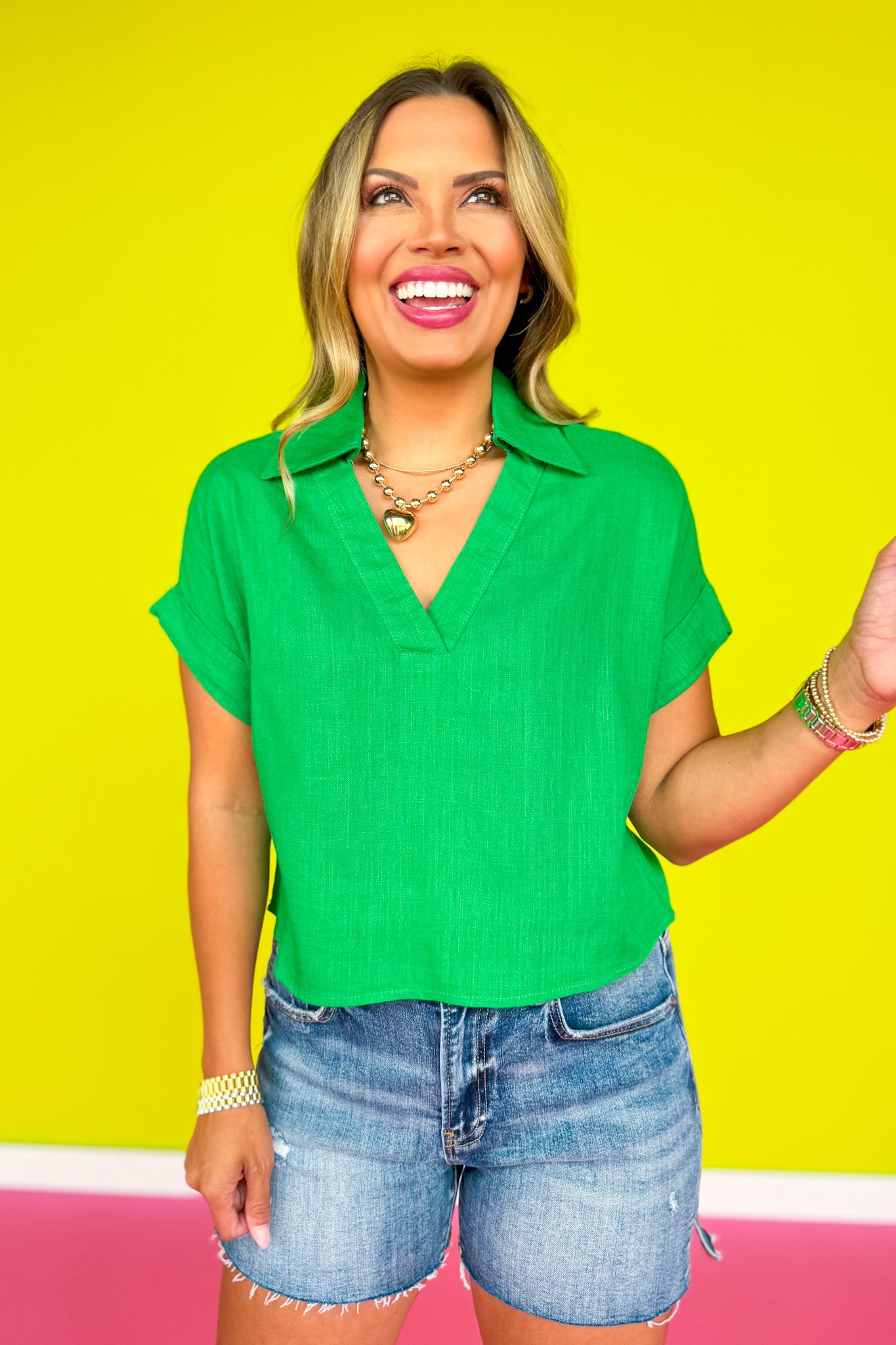 Embrace effortless style with our Green Linen Collar V Neck Short Sleeve Top. Made with breathable linen, this top features a classic collar and v-neckline, perfect for any occasion. Stay cool and comfortable while looking chic in this must-have wardrobe staple. Throw on with denim shorts and sandals for an effortless out the door look! Shop our BOTTOMS and SHOES for your perfect ensemble!