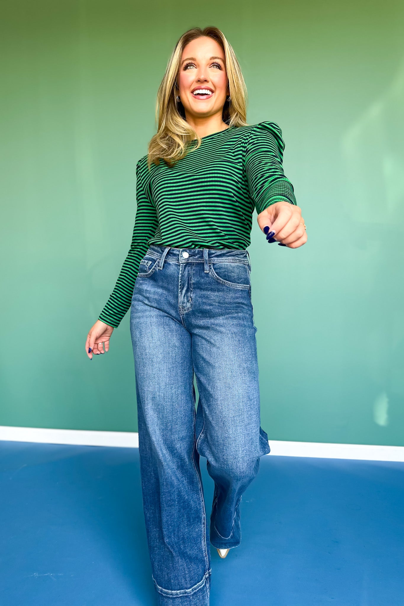 Effortless style meets everyday comfort with the Lacey Stripe Crew Neck Long Sleeve Top in Green Navy by SSYS The Label. Featuring chic green and navy stripes, this versatile top is designed with a classic crew neckline and subtle puff shoulders for a modern, feminine touch. Its slim fit and soft, breathable fabric make it perfect for layering or wearing solo throughout the seasons.