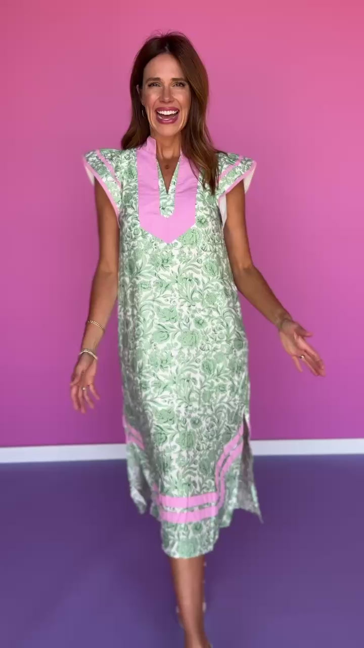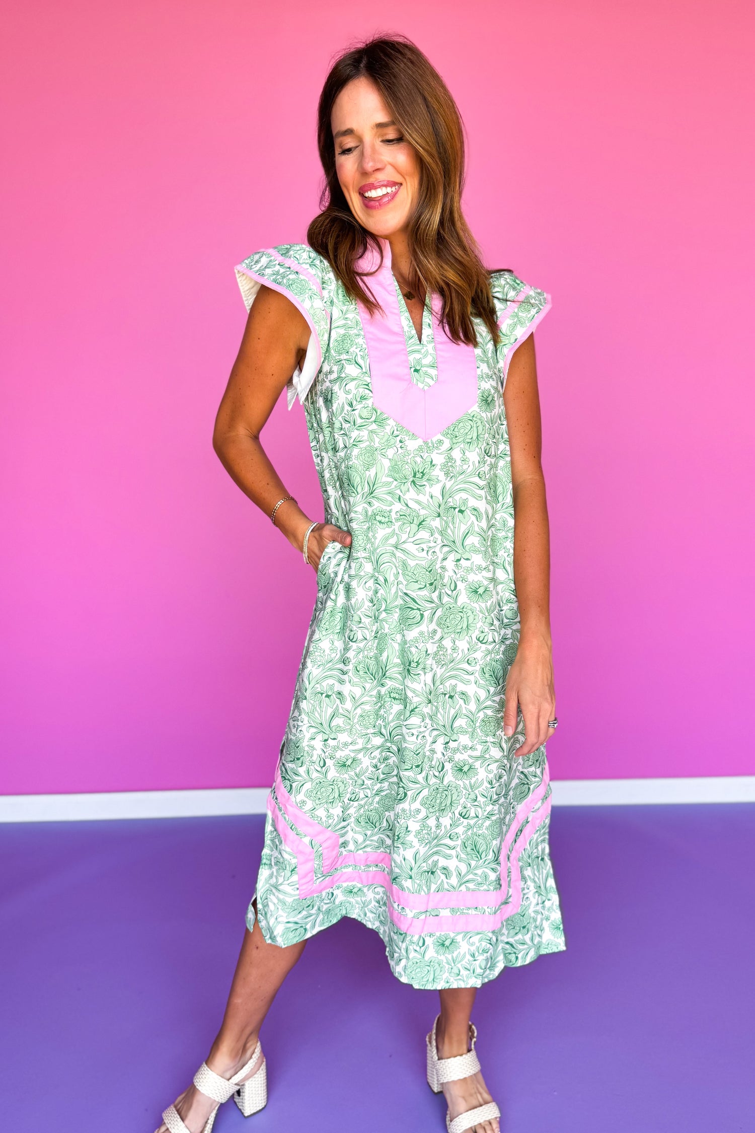 Get ready to bloom in our Green Pink Floral Contrast Collar Midi Dress! With a fun contrast collar and vibrant floral print, this midi dress is sure to turn heads. Perfect for any occasion, add a pop of color to your wardrobe with this unique dress.