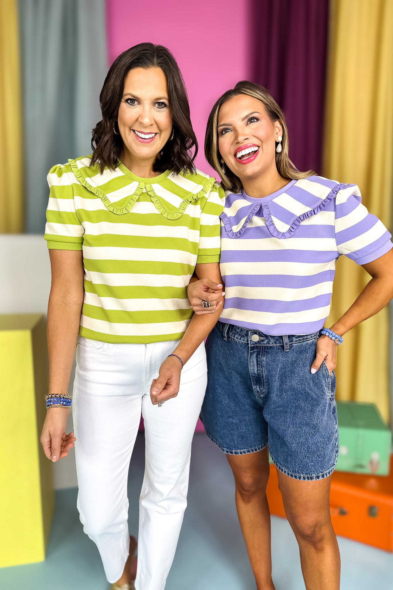 SSYS PIPPA is BACK and READY for SPRING!!! Give a round of applause for the SSYS Short Sleeve Pippa Striped Peter Pan Collar Top In Green! One our favorite silhouettes is now in short sleeves and new trend forward color ways. We love her styled with our SSYS Denim Mom Shorts or white denim to create a preppy and chic OOTD! Your girl is back, don't miss out on her!