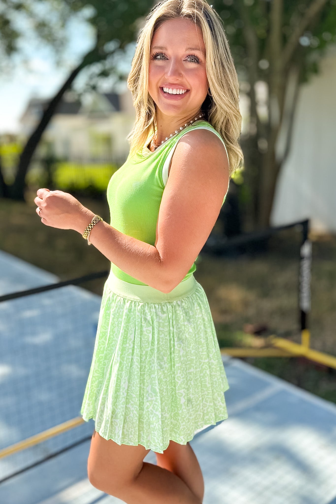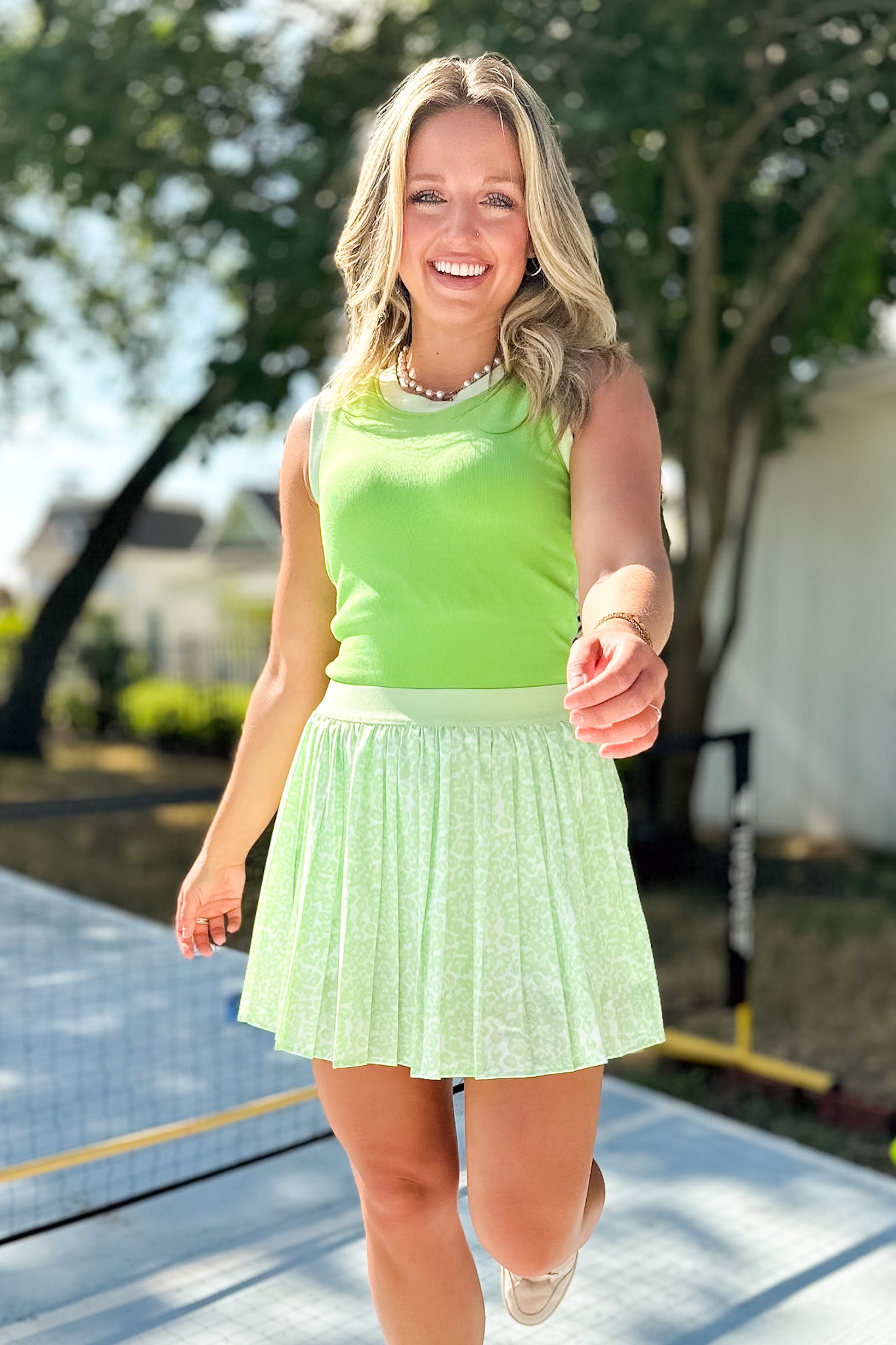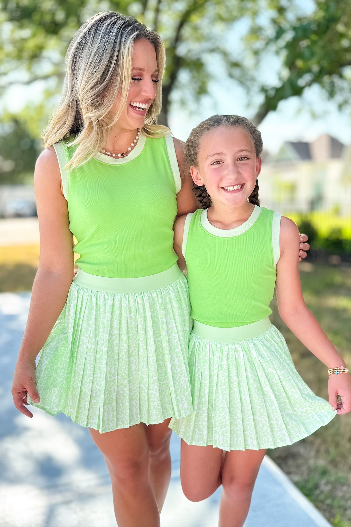 The SSYS Ribbed Contrast Crew Neck Tank in Green is a stylish staple with a playful twist! Crafted from a soft, ribbed knit, this tank features a classic crew neckline with bold contrast trim for a sporty yet polished feel. The green hue offers easy pairing with everything from denim to skirts, making it perfect for everyday wear. Create a colorful combo by pairing with the SSYS Lottie Pleated Skort In Lime Animal. Bonus: it’s part of a matching MOMMY & ME drop—perfect for coordinated moments with your little one. Whether you're twinning at the park or coordinating for weekend errands, this tank brings effortless style to both Mom and Mini!