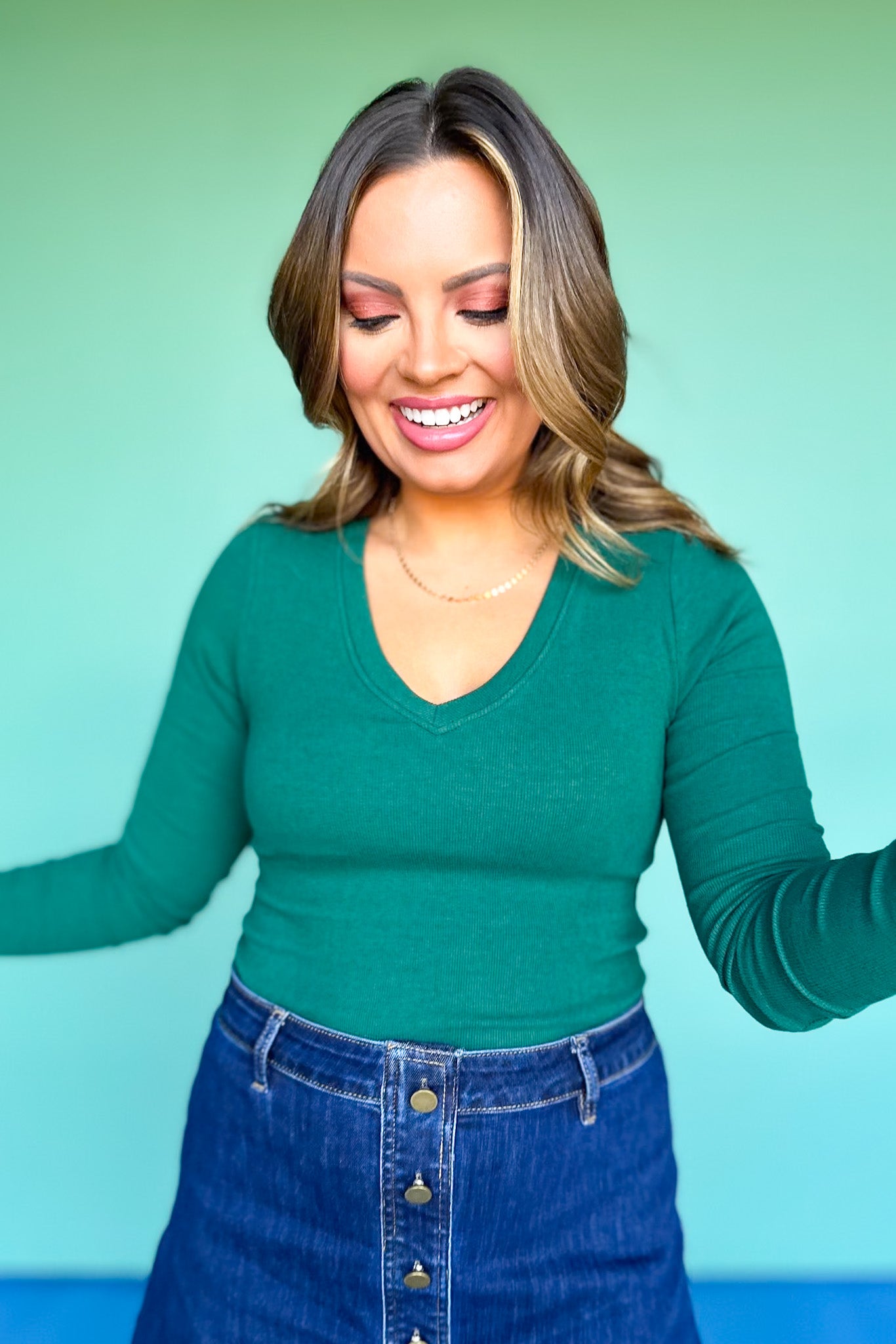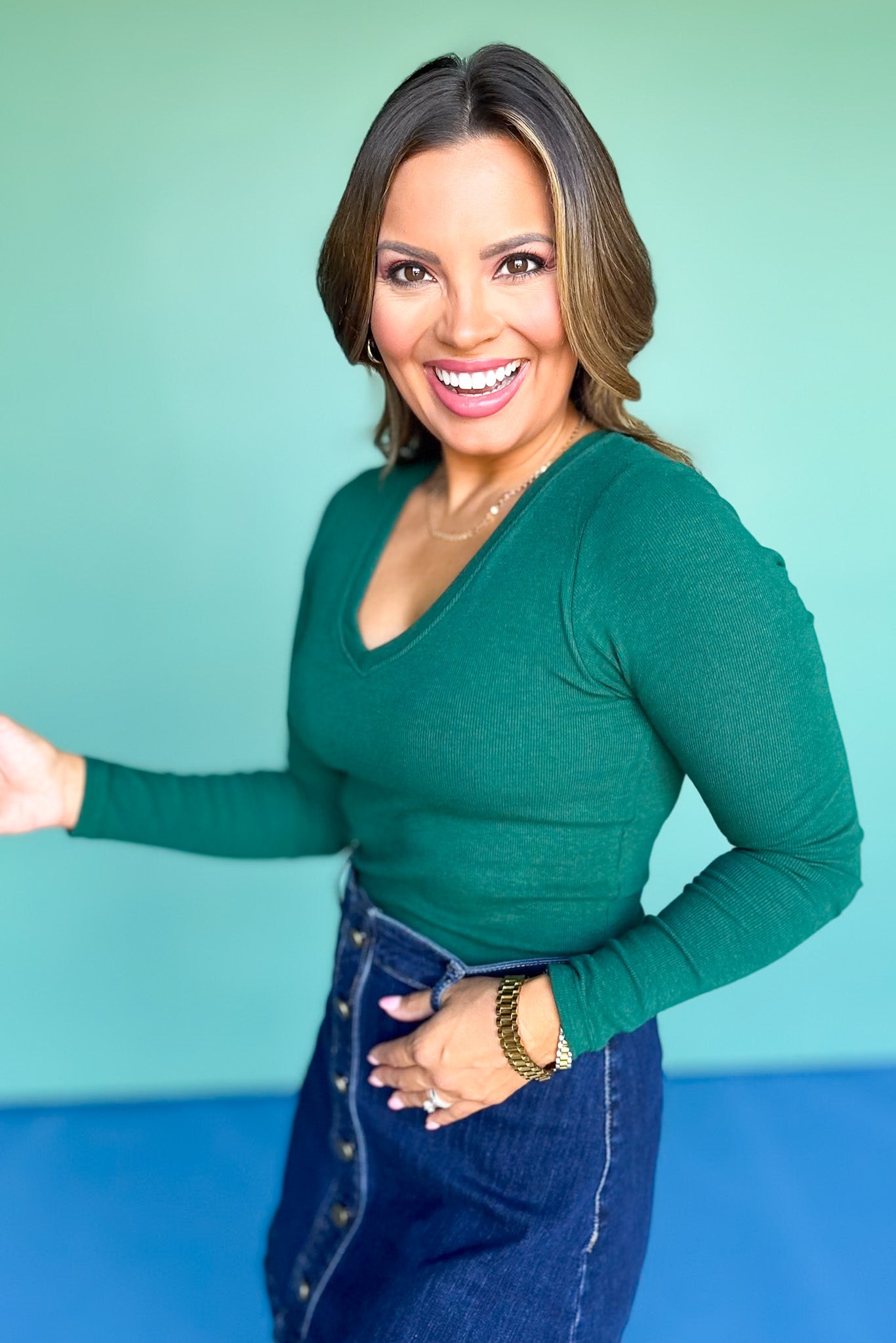 ESSENTIALS LOADING!!! Introducing the SSYS Ribbed V Neck Long Sleeve Top In Hunter – A sleek essential you can never have too many of. Designed in our signature soft, ribbed knit, this top hugs in all the right places while offering all-day comfort. The flattering V neckline, fitted long sleeves, and built in bra provide both style and support, so you can skip the extra layers. In a rich hunter hue, it adds a fresh, versatile touch to your everyday wardrobe, from polished office looks to laid-back weekends. Style with your fave denim for an effortless out the door look! Shop our collection of BOTTOMS and SHOES to build your ensemble!