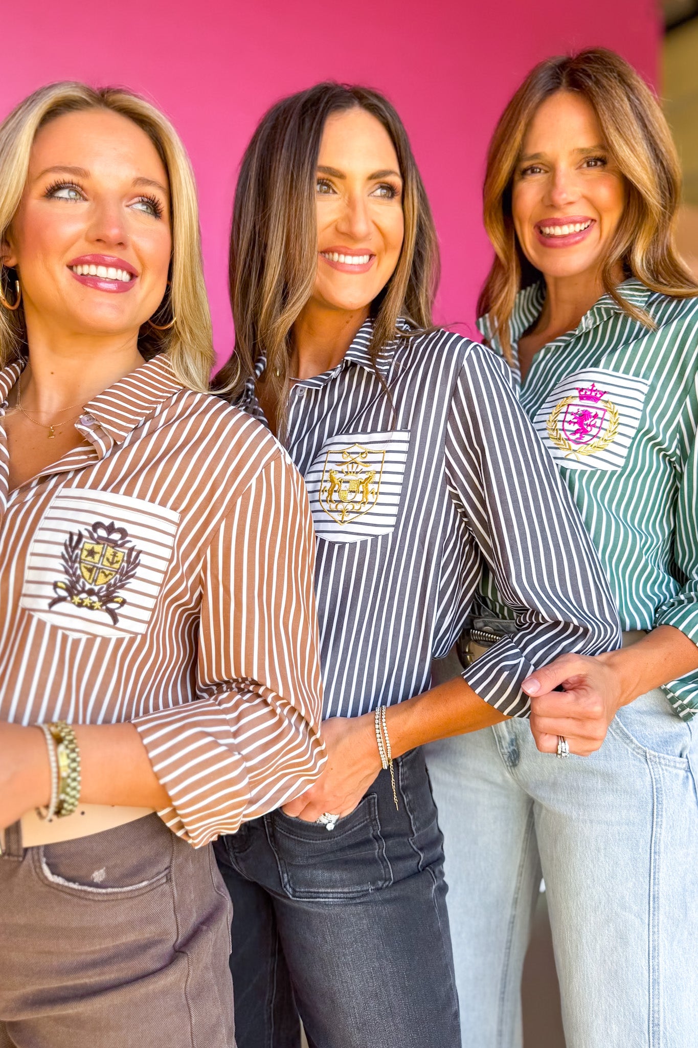 SHOW STOPPING piece y'all have been going CRAZY over! Introducing the SSYS Collette Poplin Stripe Embroidery Top In Hunter! Crafted from crisp, lightweight poplin, this top features timeless vertical stripes that create a flattering, elongating silhouette. The contrast embroidery crest detailing adds a refined touch of texture and artistry, making it a standout piece for both casual and polished looks. Designed with a relaxed fit and classic collar, Collette pairs effortlessly with your favorite denim — perfect for workdays, weekends, and everything in between! Shop our DENIM and SHOES to build your chic OOTD!