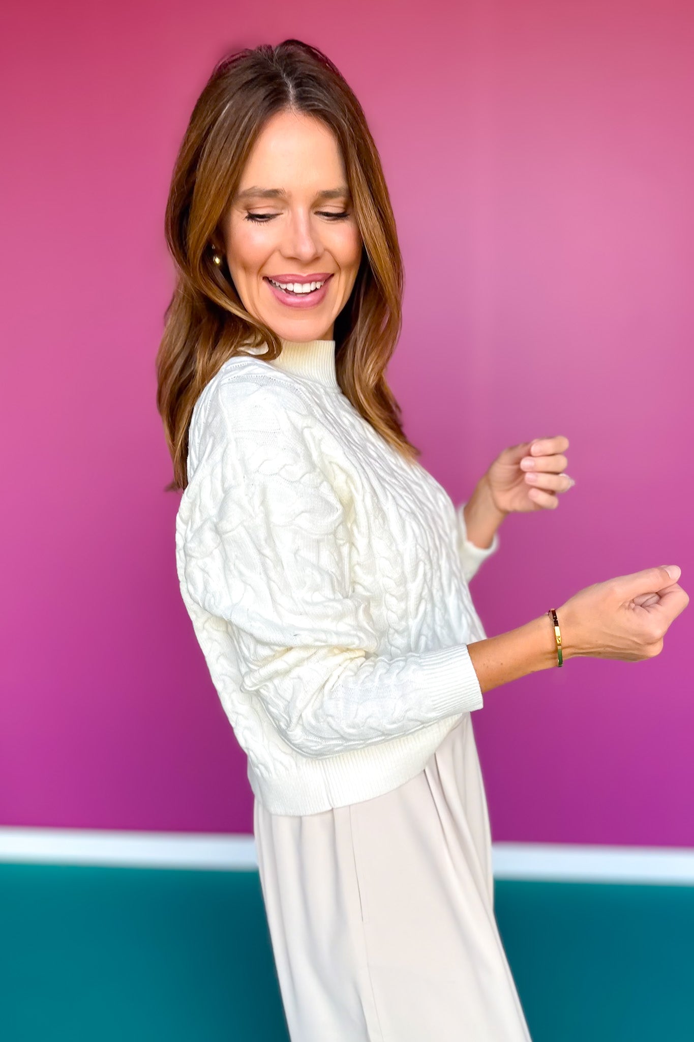 Add a touch of classic chic to your cool-weather lineup with the SSYS Giselle Cable Knit Mock Neck Sweater In Ivory. Crafted in a soft cable knit with a modern mock neck, this versatile ivory hue brings sophistication to a timeless texture. The relaxed fit makes it perfect for layering, while the polished finish elevates your everyday denim, skirts, or tailored trousers. We love Giselle styled with our SSYS Jules Slit Skort In Teal, so CHIC!
