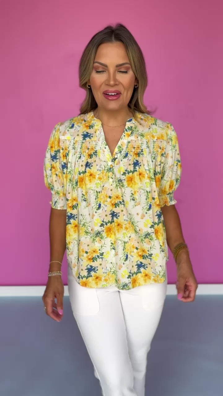 Ivory Yellow Floral Smocked Yoke Split Neck Top *FINAL SALE*
