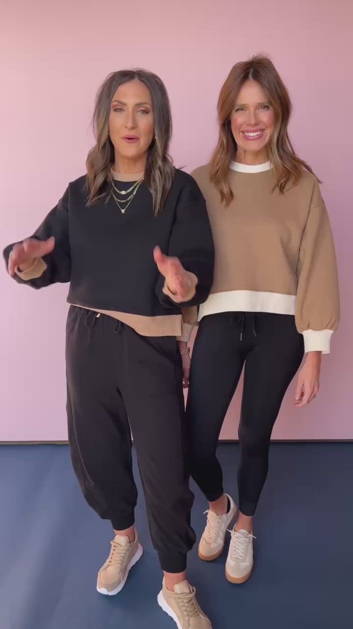 Our BEST FRIEND is BACK GALS!!! Introducing the SSYS Sloan Bubble Sleeve Colorblock Pullover In Light Brown Ivory! Our girl Sloan is an easy and ageless silhouette that will continue to be on REPEAT in your closest. She is a reasonable length, cozy on the inside and can be styled in various ways! Throw on and go with any of our high waisted athlesisure BOTTOMS or your fave high waisted DENIM to tackle your day in chic SSYS fashion!