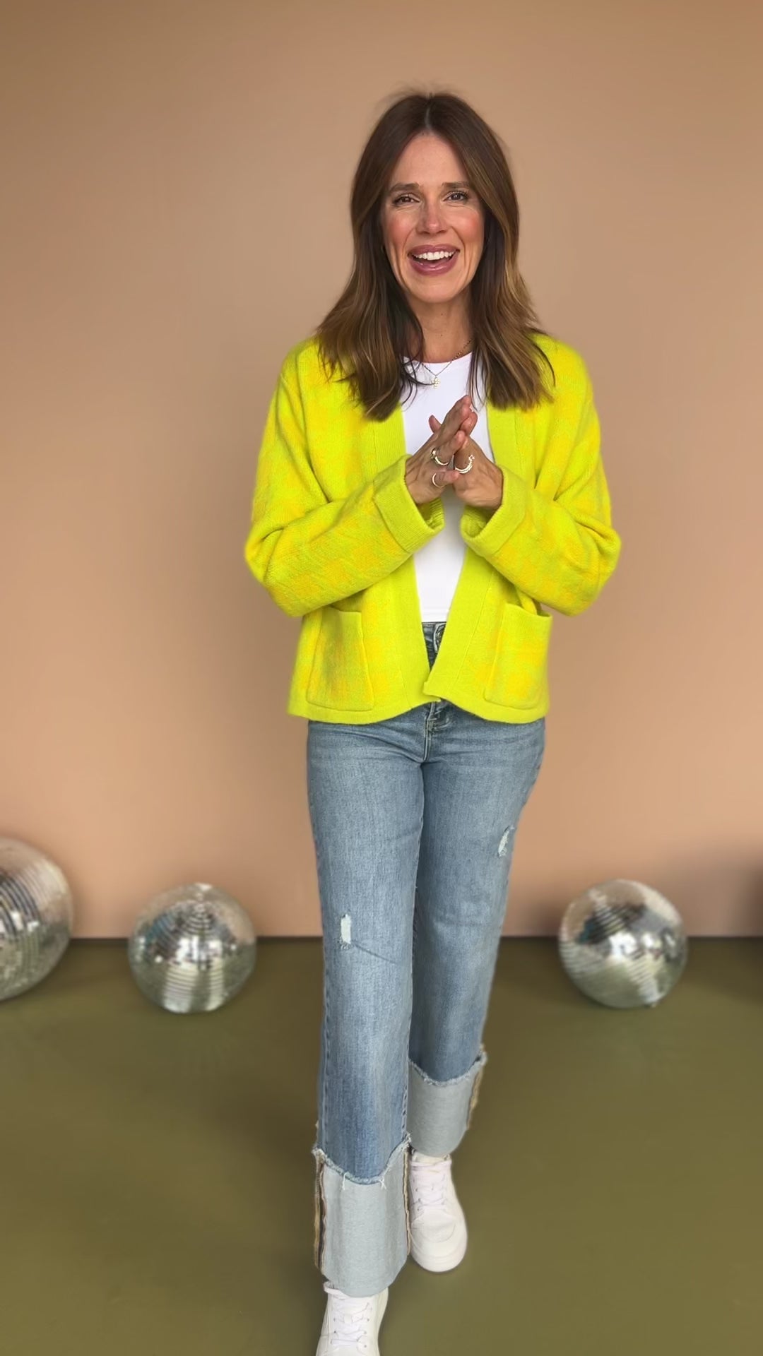 OBSESSED Gals! Get ready to make a statement with our Lime Houndstooth Check Print Front Pocket Cardigan! Adding a pop of color and unique print to your wardrobe, this cardigan is perfect for adding a playful touch to any outfit. So why not stand out from the crowd with this whimsy and fun piece?! Style with a basic white tee and your fave denim and own the day in chic style! Shop our DENIM and SHOES to elevate your look!