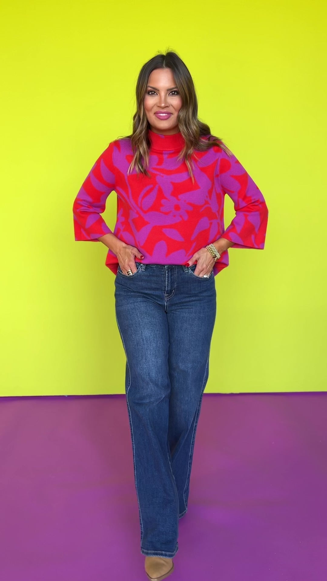 Flaunt your vibrant style with this Magenta Floral Print Bell Sleeve Sweater. The playful bell sleeves and colorful floral print add a touch of personality and whimsy chic to this cozy knit, making it perfect for any casual occasion. Style with your fave denim and make a statement wherever the day takes you! Shop our DENIM and SHOES to polish off your look!